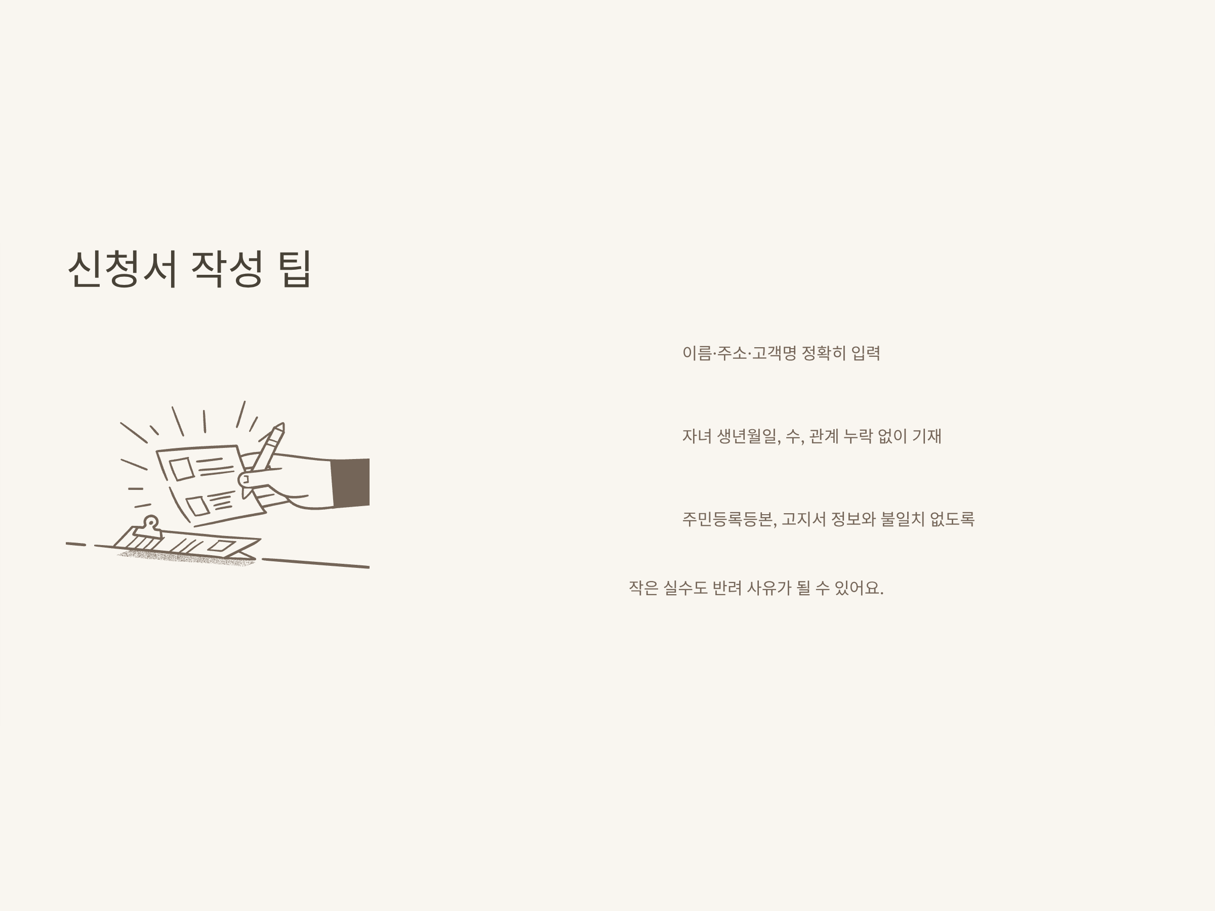 신청서 작성 시, “자녀 수·나이” 항목을 빠짐없이 체크하고, 주소지·고객명 등은 반드시 전기요금 청구서와 일치하도록 적으셔야 합니다. 누락이나 오기재가 있으면 처리가 지연되거나 반려되는 경우도 많으니 마지막까지 꼼꼼하게 확인하는 게 안전합니다.
