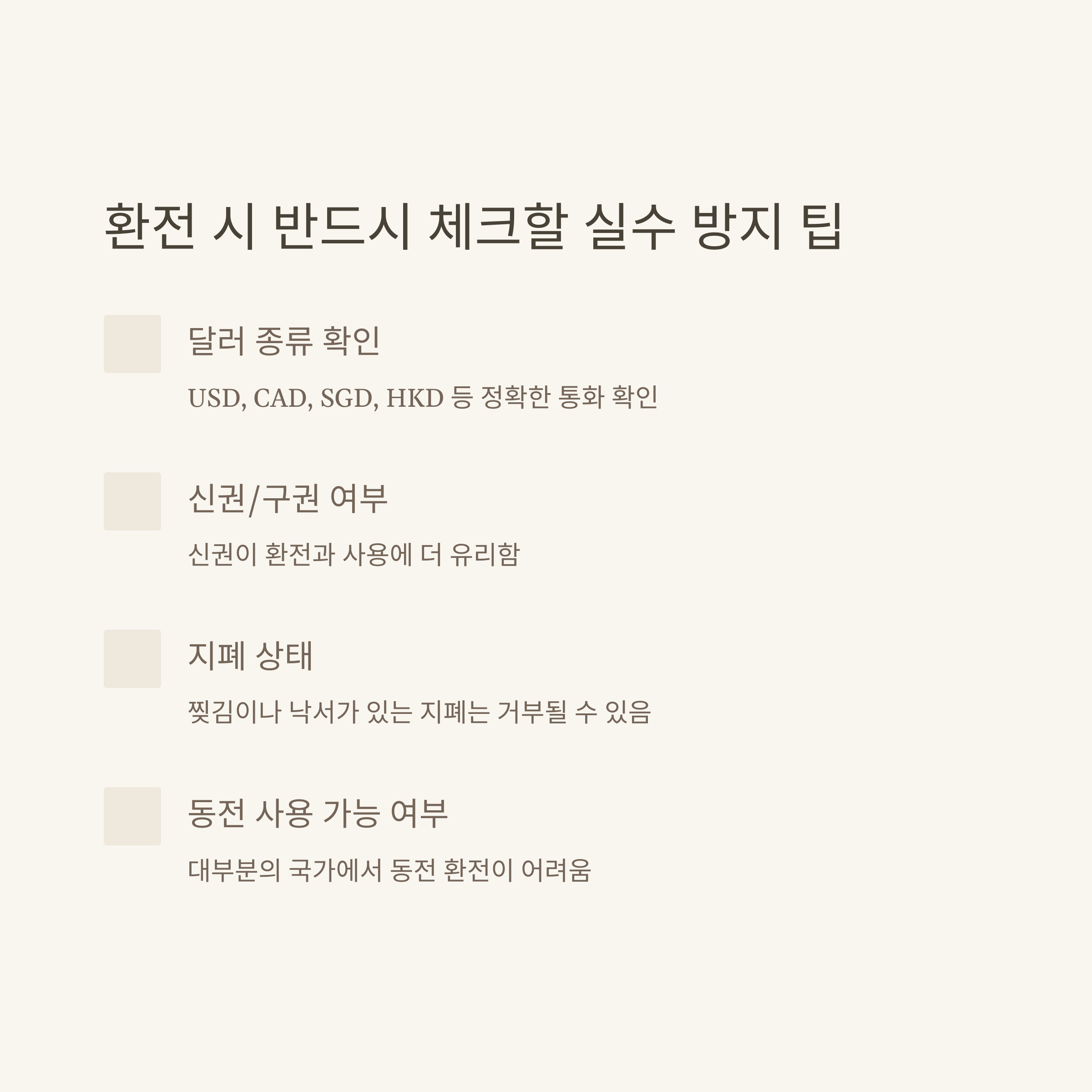 | 미국 | $1~$100/1¢~$1 | 신권/구권 구분 필수 | 소액권·신권 중심 환전 |