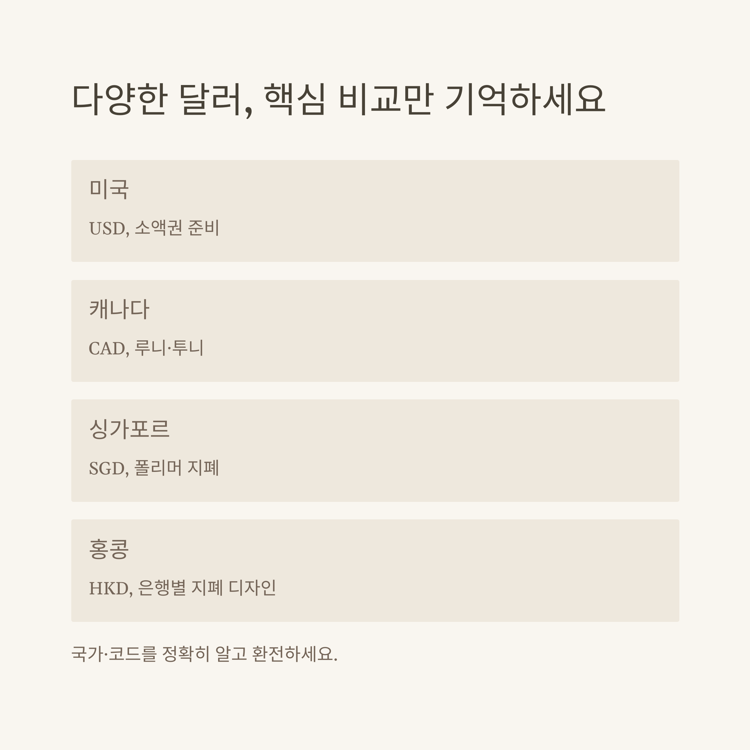 달러 종류 완벽정리 – 미국·캐나다·홍콩·싱가포르 달러 권종·동전·지폐·환전 실사용 꿀팁 공식가이드