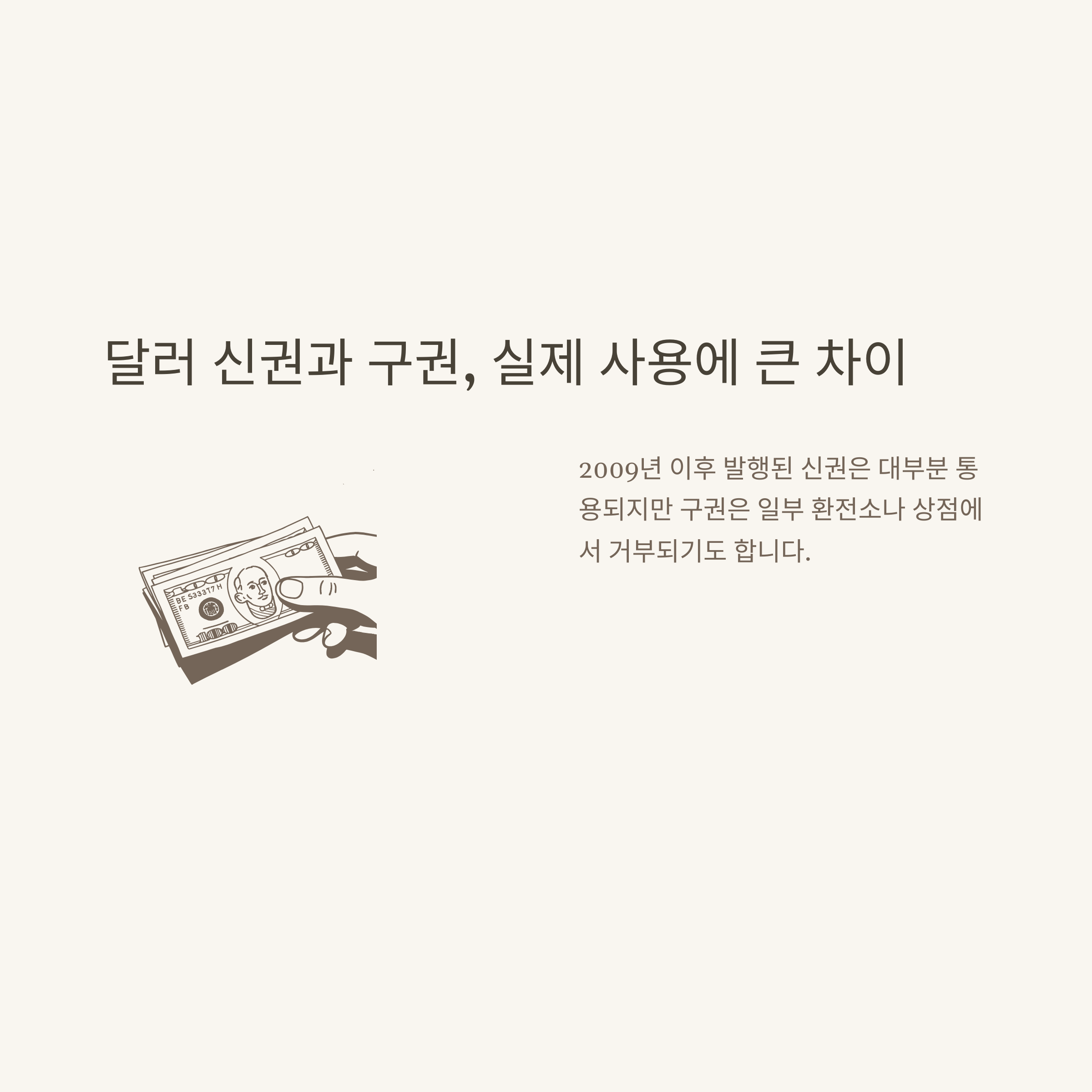환전할 때 구권은 거절되거나, 현지에서 사용할 때 위조지폐 오해를 살 수 있습니다. 은행에서도 “신권으로만 교환 가능합니다”라는 말을 종종 들었습니다. 특히 미국 $100, $50 지폐는 신권(큰 얼굴 디자인)으로만 환전하시는 걸 추천합니다.