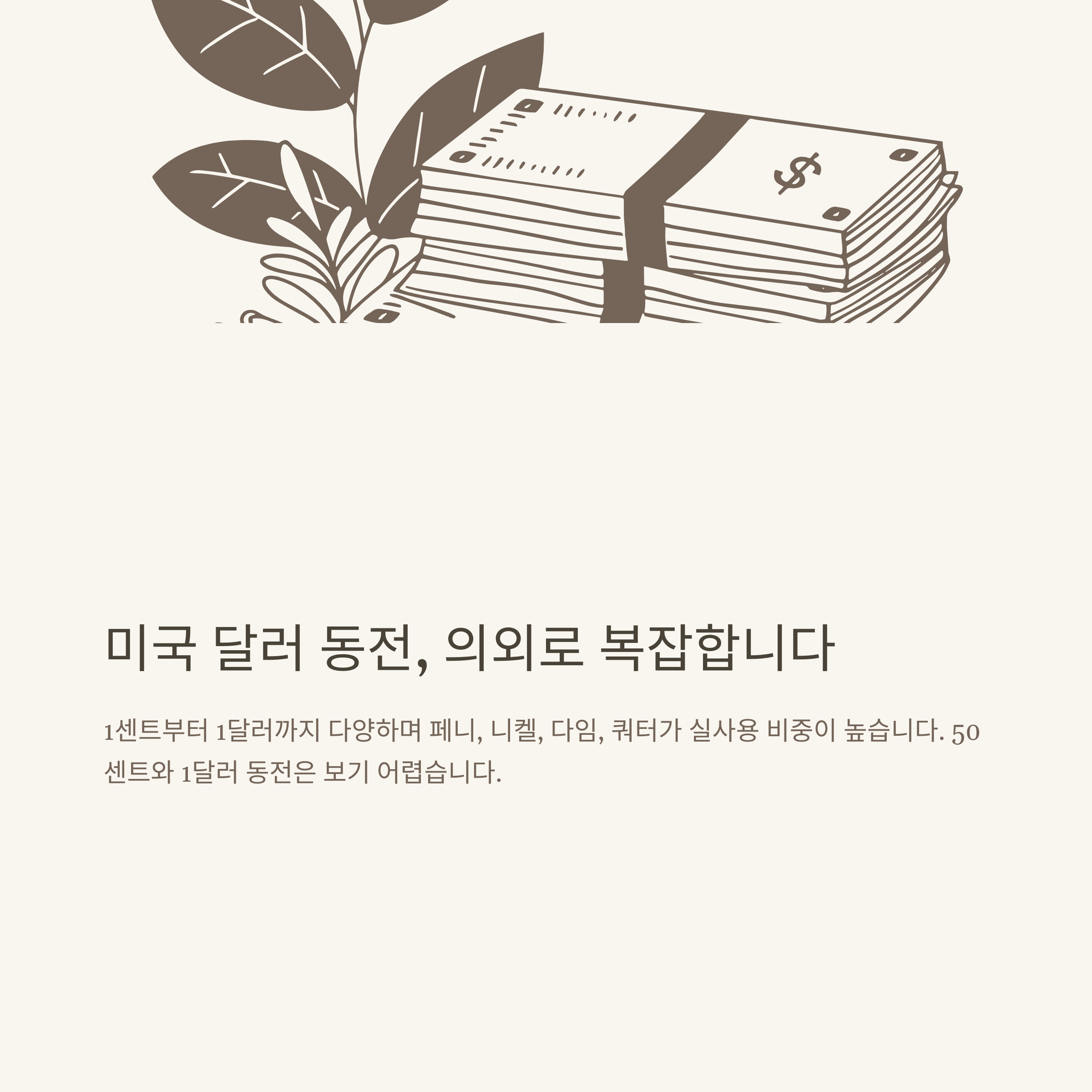 동전은 1¢(페니), 5¢(니켈), 10¢(다임), 25¢(쿼터), 50¢(하프달러), $1(달러)로 구분됩니다. 실생활에서 가장 많이 쓰는 건 1¢, 5¢, 10¢, 25¢(쿼터) 정도입니다.
