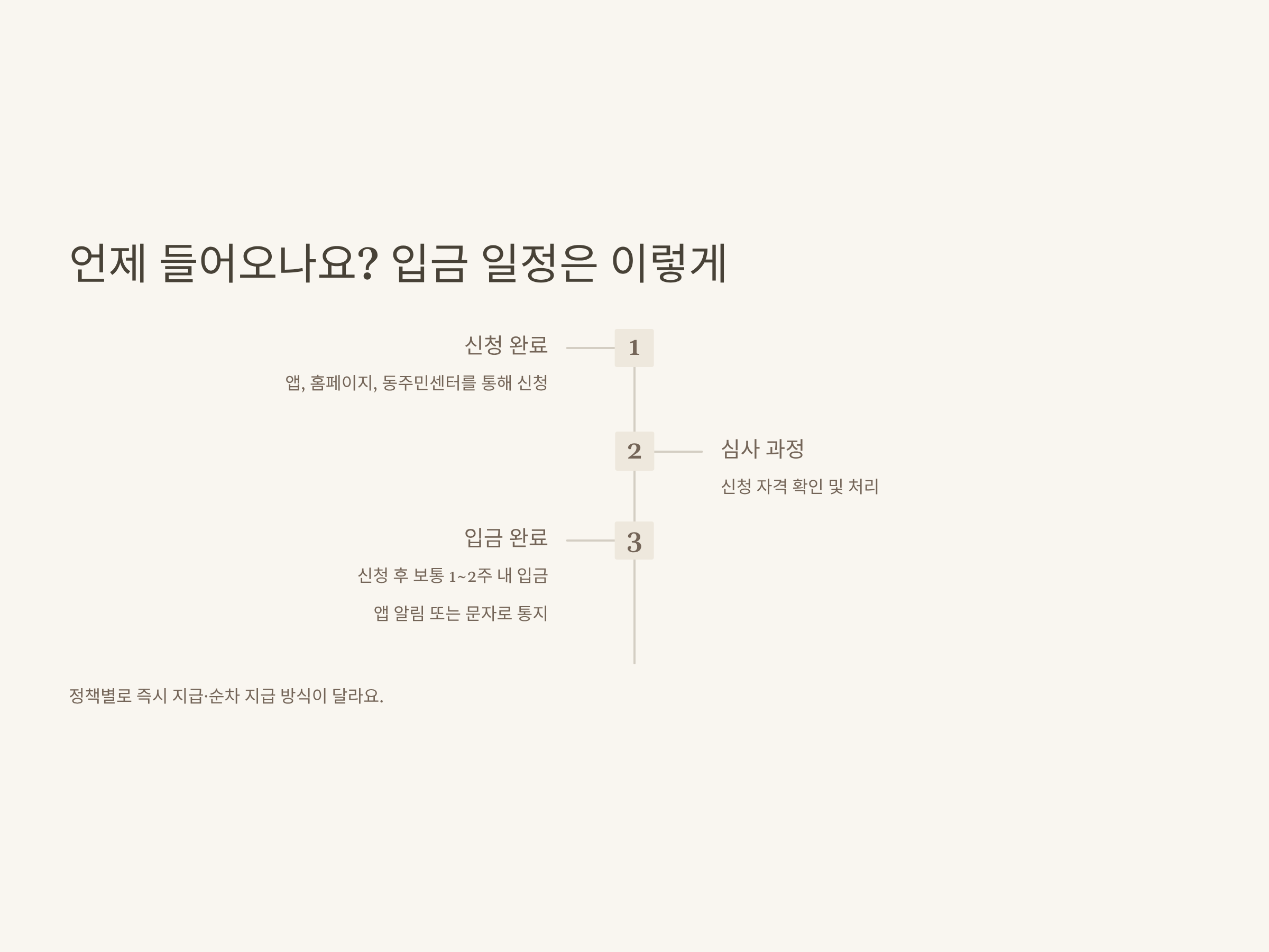 | 일반 정책지원금 | 신청 후 5~14일 내 | 앱 알림, 잔액 메뉴 |