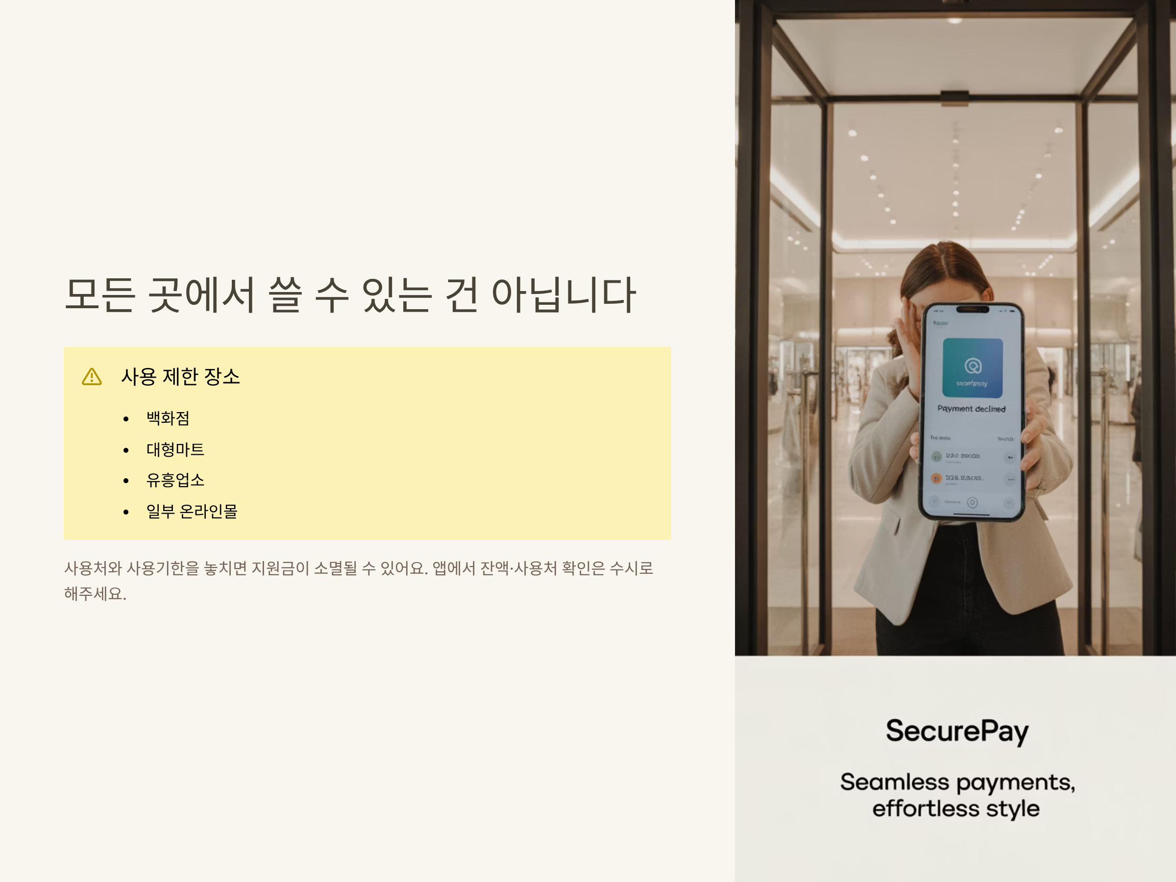 - 사용이 제한되는 대표 업종은 백화점, 대형마트, 유흥·레저업종, 일부 온라인 결제처(예: 쿠팡 등)로, 반드시 공식 가맹점 확인이 필요합니다. 정책별로 사용 가능한 업종·불가 업종이 조금씩 다르니 꼭 공고문을 확인하세요.