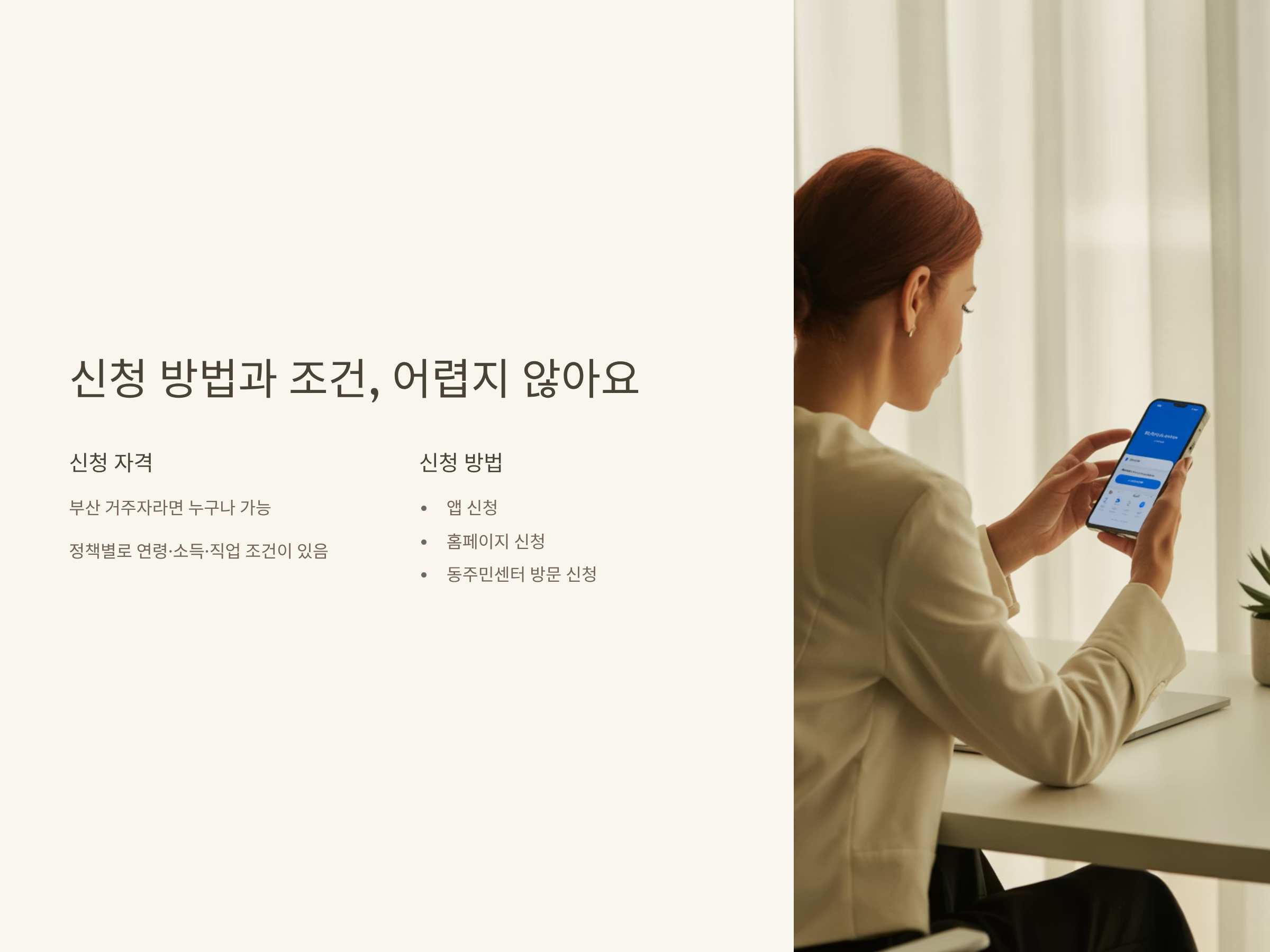 - 가장 기본적인 조건은 부산시 거주자(주민등록상)여야 하며, 연령·소득·직업 등 정책별 세부 조건이 있습니다. 모바일 앱, 부산시 홈페이지, 동주민센터 등 다양한 채널로 신청 가능합니다.