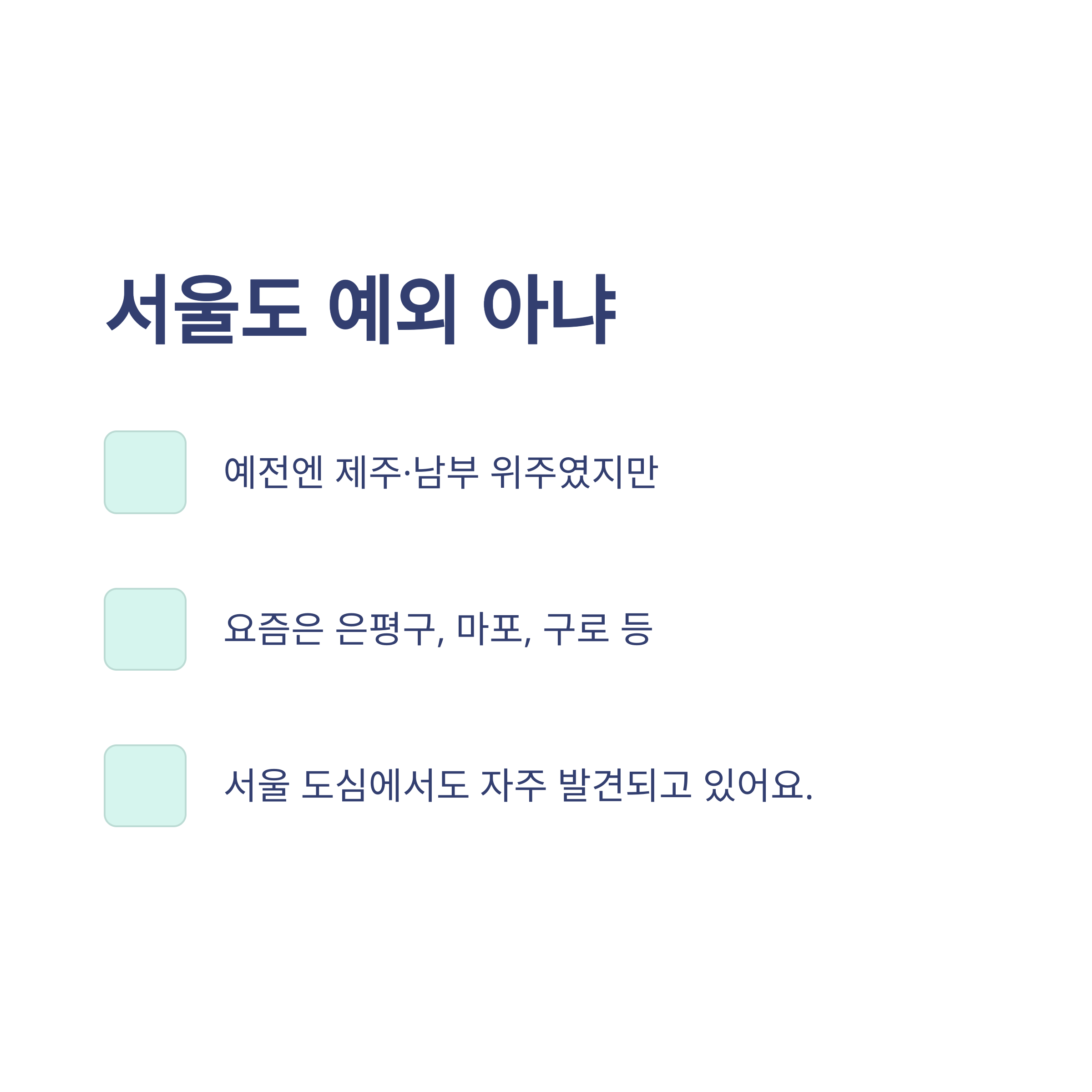 예전엔 제주도나 남부 지방에 국한되던 현상이었지만, 최근 몇 년간 기후 변화로 인해 서울, 경기 북부 지역까지 출몰 범위가 확산되고 있는 상황입니다. 특히 은평구, 마포구, 구로구 등 도심과 인접한 산간지역에서 목격 빈도가 높아졌어요.