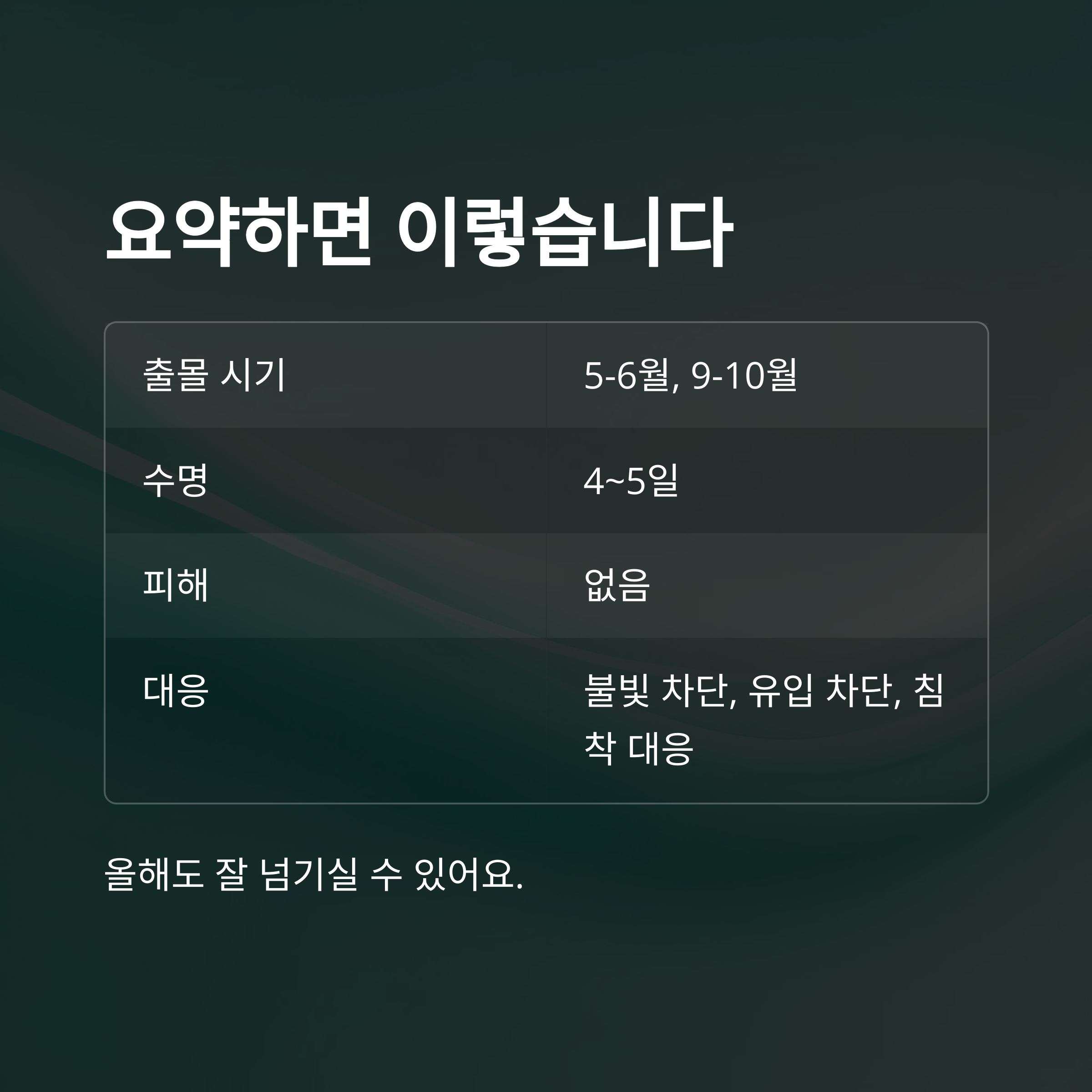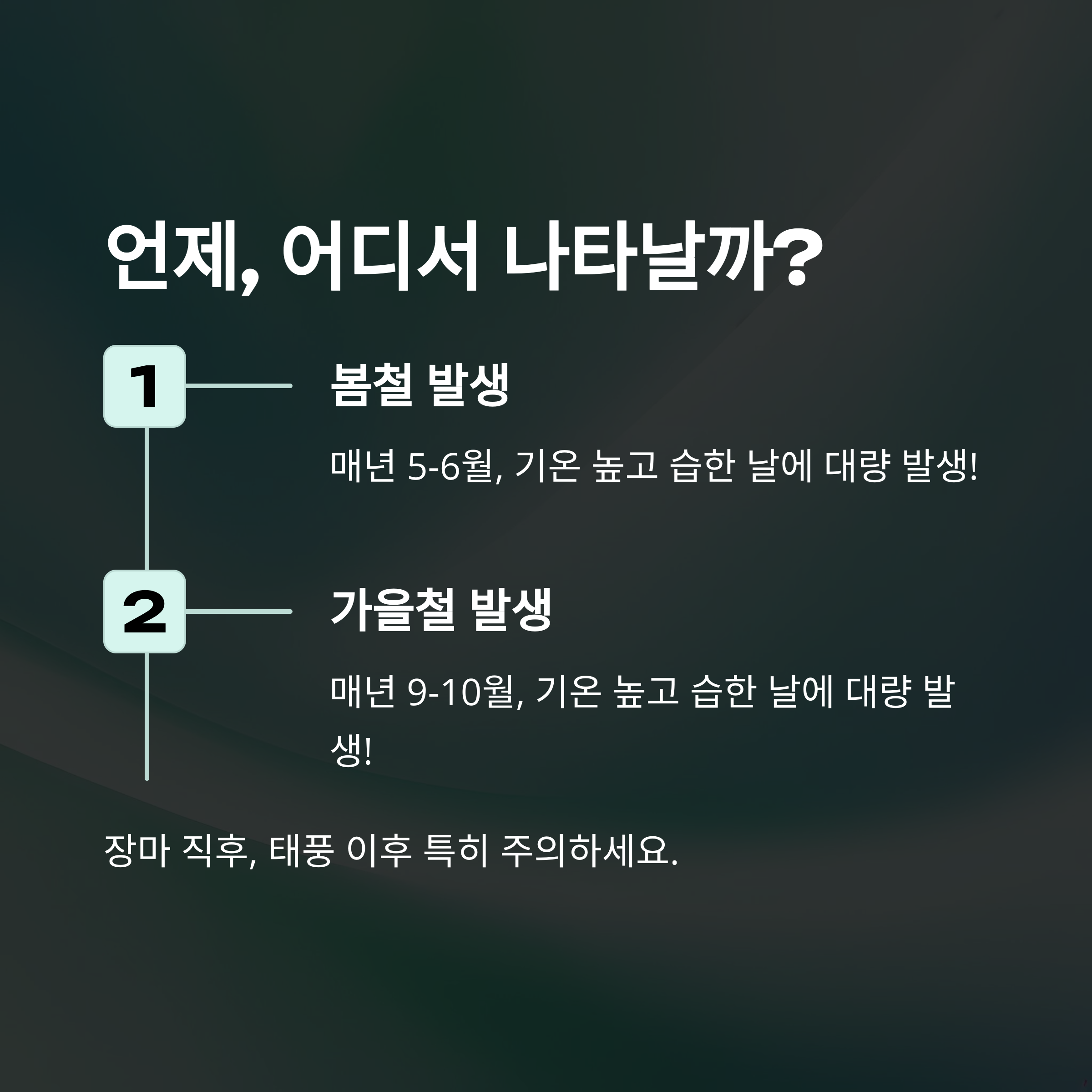한 해에 두 번, 봄(5~6월), 가을(9~10월)에 주로 발생하며, 기온과 습도가 높은 날에 활동이 활발해져요. 특히 장마 직후, 혹은 태풍이 지난 후 습도가 확 올라가는 시점에 몰려드는 경향이 뚜렷합니다.