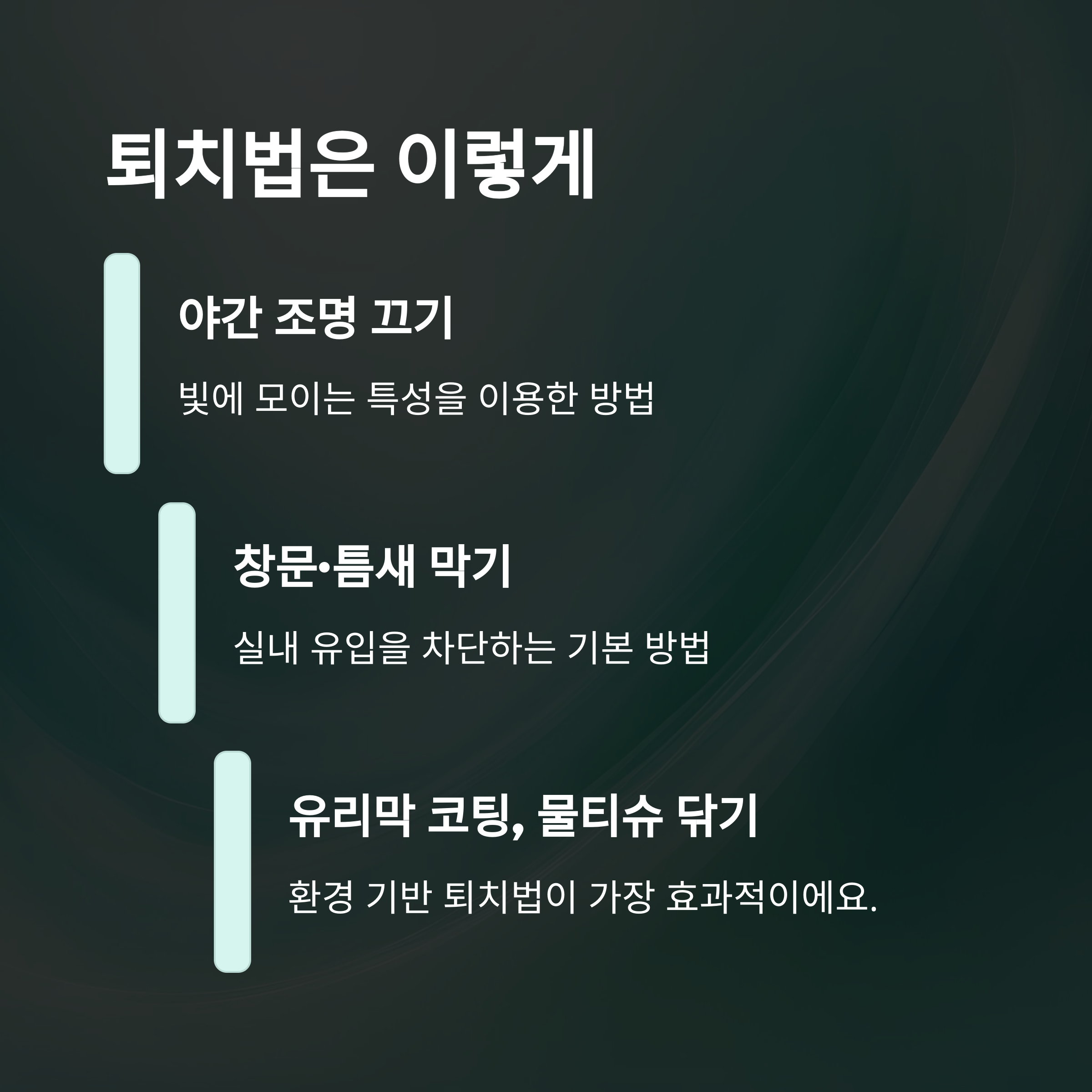 | 퇴치 방법 | 불빛 차단, 창호 봉쇄, 세차 관리 |