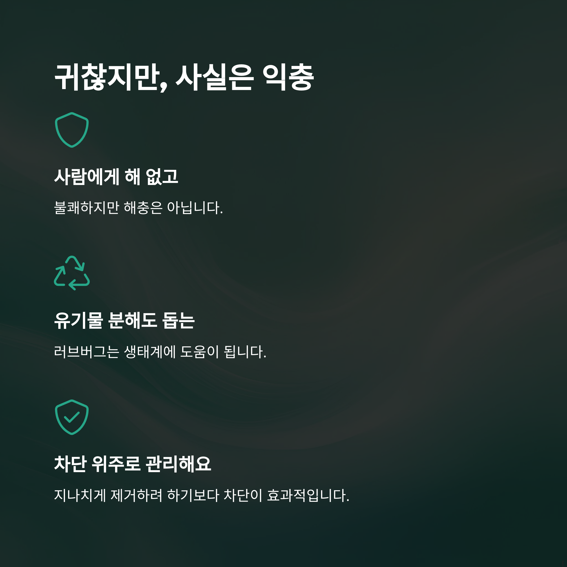 다만, 대량으로 출몰할 경우 불쾌감, 위생 문제, 차량 전면 유리 오염 등의 불편을 유발할 수 있어 관리가 필요하긴 합니다. 이런 이유로 ‘해충처럼 느껴질 수는 있지만, 실질적인 피해는 없다’는 점을 꼭 참고해주세요.