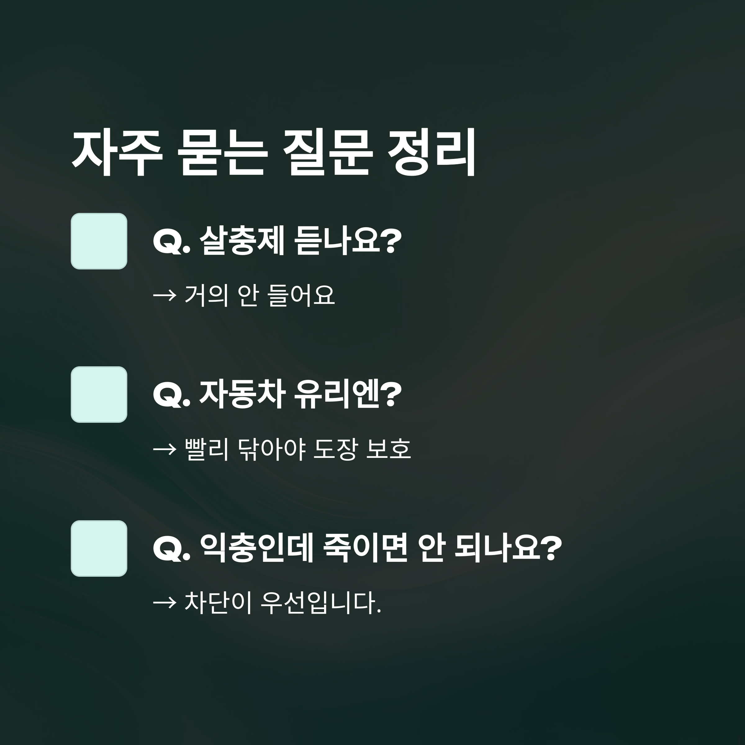 추가로, 차량 앞유리에 잔여물이 남았을 경우 빠르게 세차해주시는 게 좋습니다. 러브버그의 체액은 시간이 지나면 도장을 손상시킬 수 있거든요. 자세한 방제 가이드는 농촌진흥청 자료에서도 확인 가능합니다: 농촌진흥청 공식 사이트