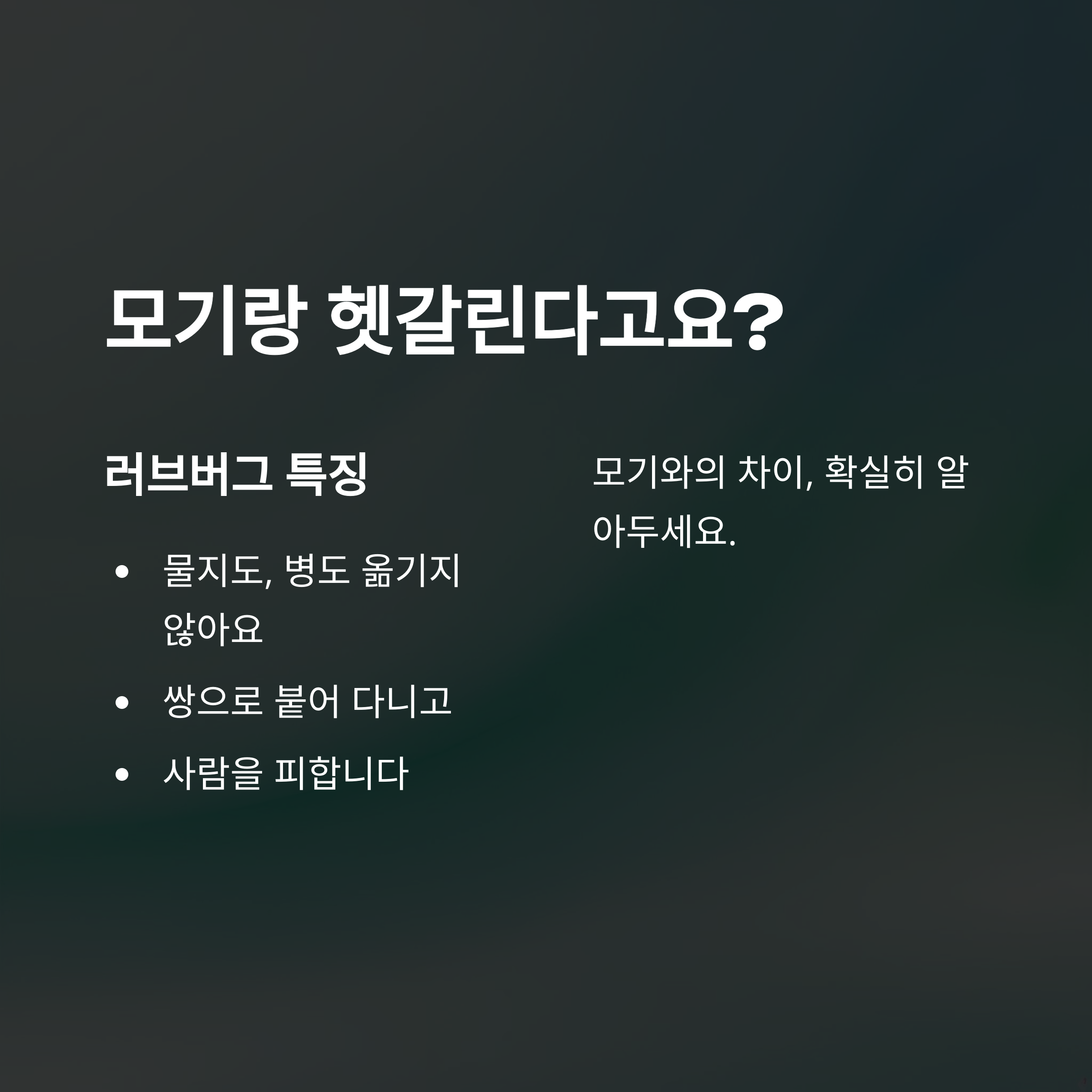 러브버그를 처음 보면 “모기야?”라고 생각하실 수 있어요. 특히 몸집이나 날개짓이 비슷해 보일 수 있는데요, 실제로는 전혀 다른 종입니다.