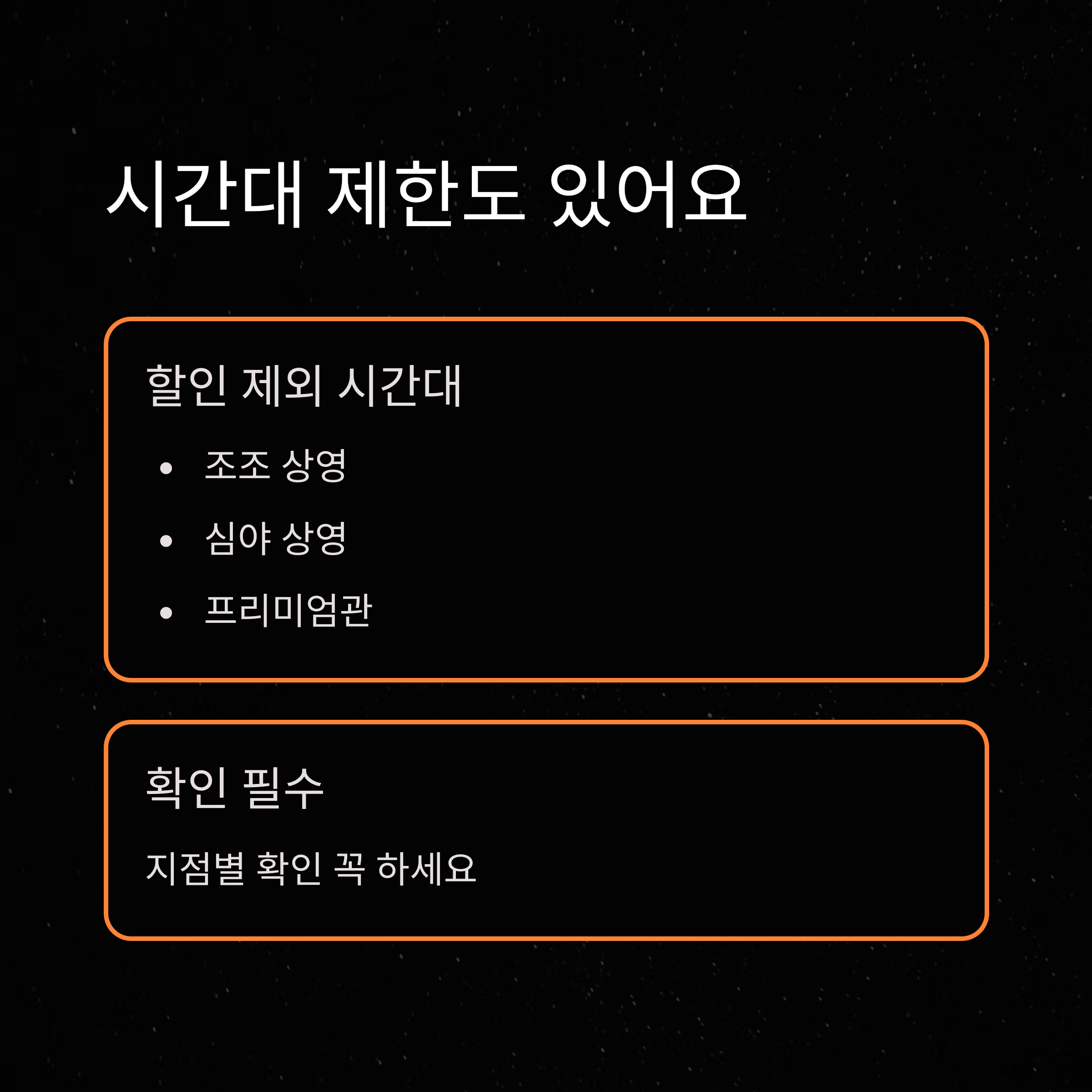 - 심야 영화 (오후 11시 이후 시작): 대부분 할인 제외