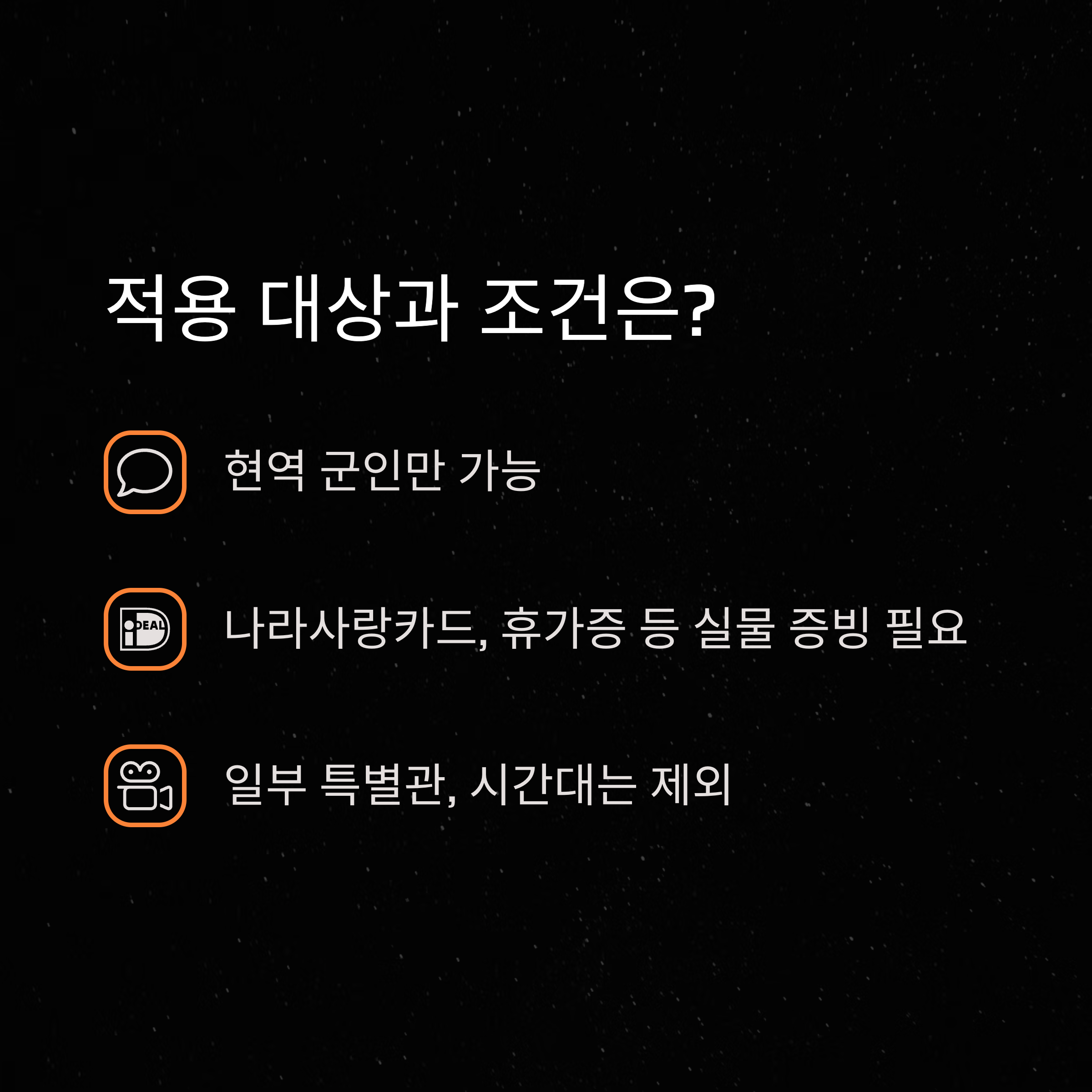 | 필요 서류 | 나라사랑카드, 휴가증, 군인 신분증 |