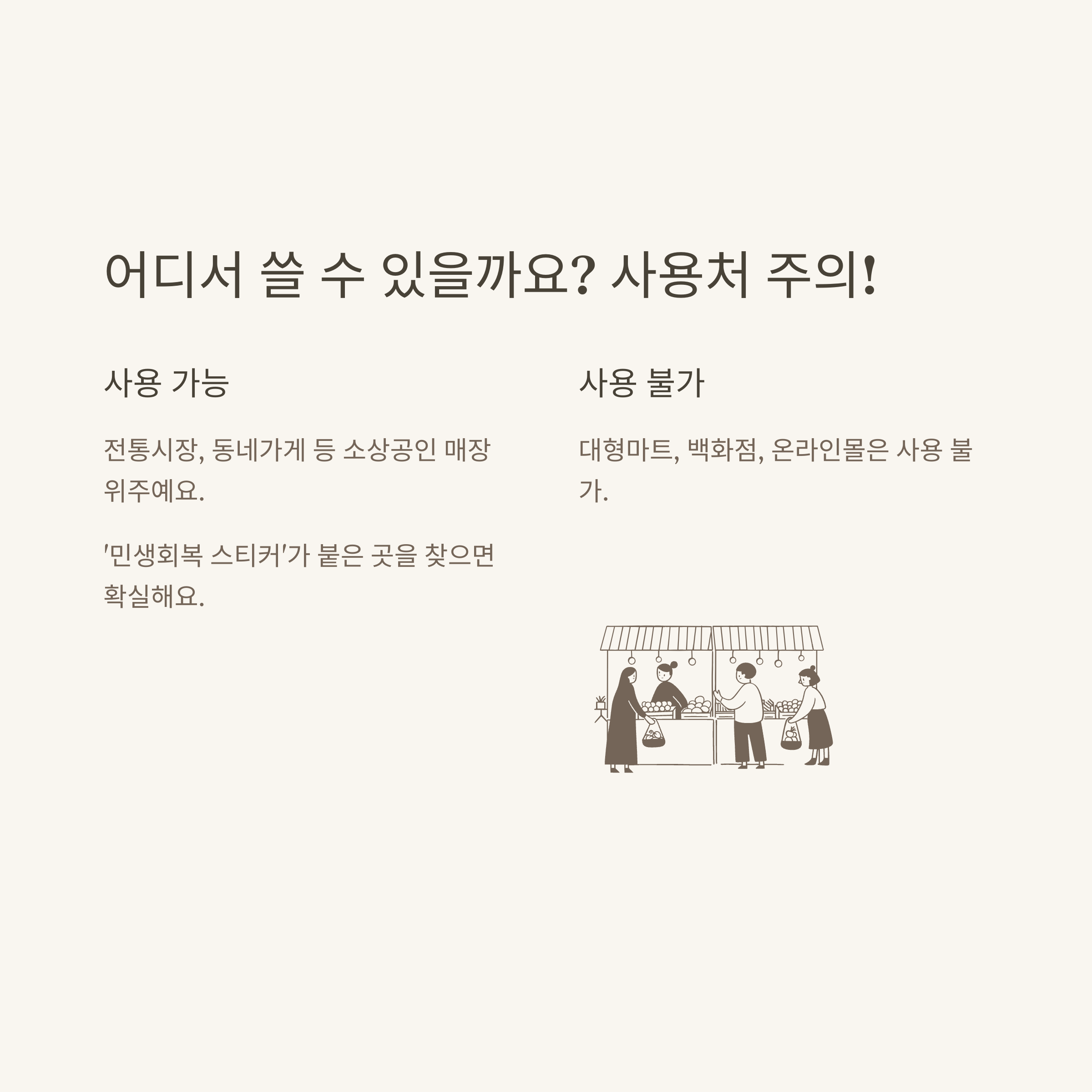 - 지정 가맹점(동네상권, 전통시장 등)만 결제 가능