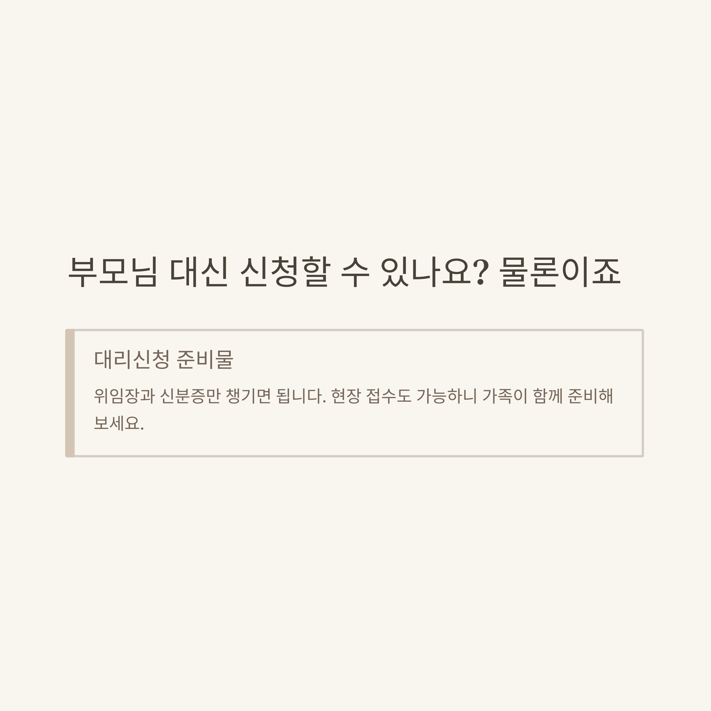 직접 신청이 어려운 경우에는 가족 대리신청, 현장 접수 등 다양한 방법을 활용할 수 있습니다. 저도 부모님 대신 대리접수 경험이 있는데, 현장에서 위임장과 신분증만 제대로 챙기면 접수 절차는 어렵지 않았습니다.