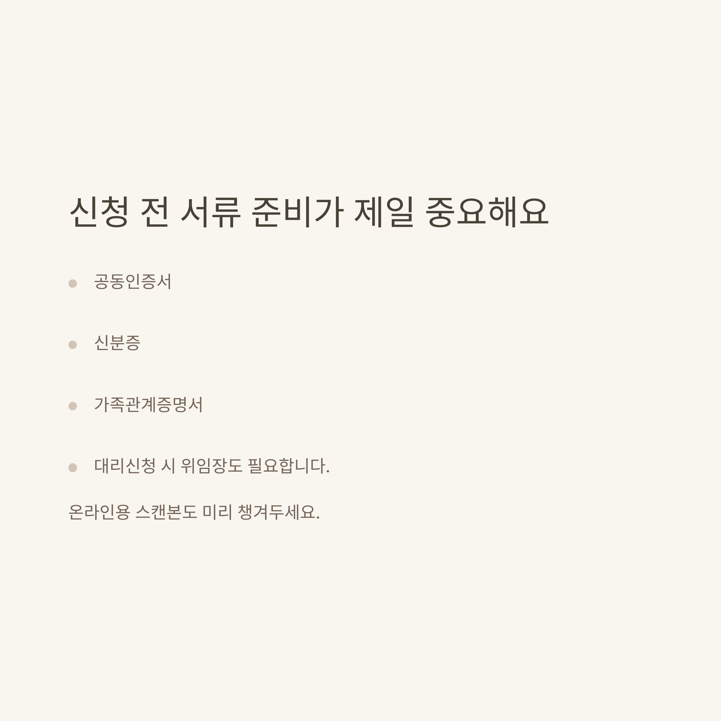 - 가족 대리신청: 위임장, 가족관계증명서, 신분증