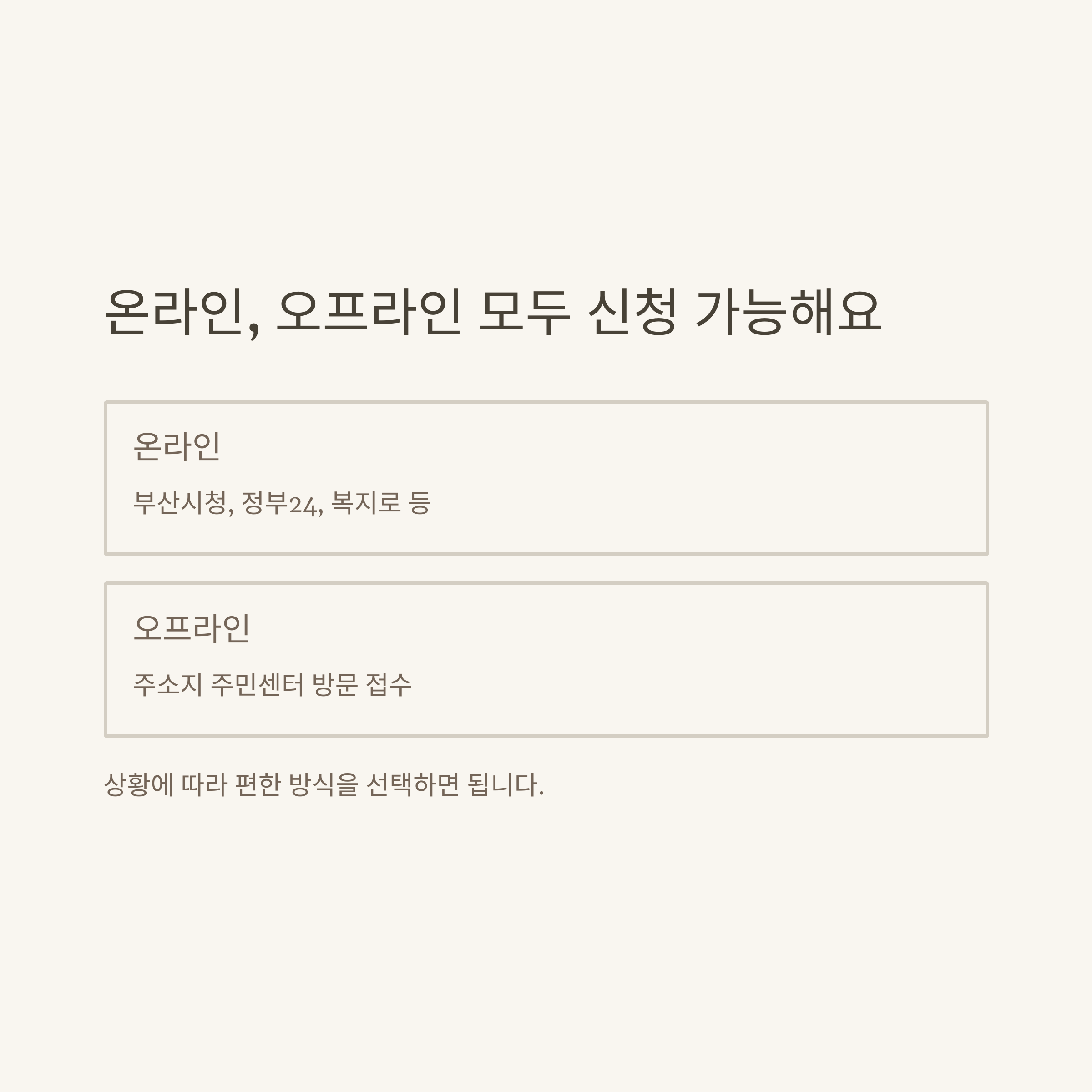 - 온라인: 부산시·구청 홈페이지, 정부24, 복지로 등 공식 포털