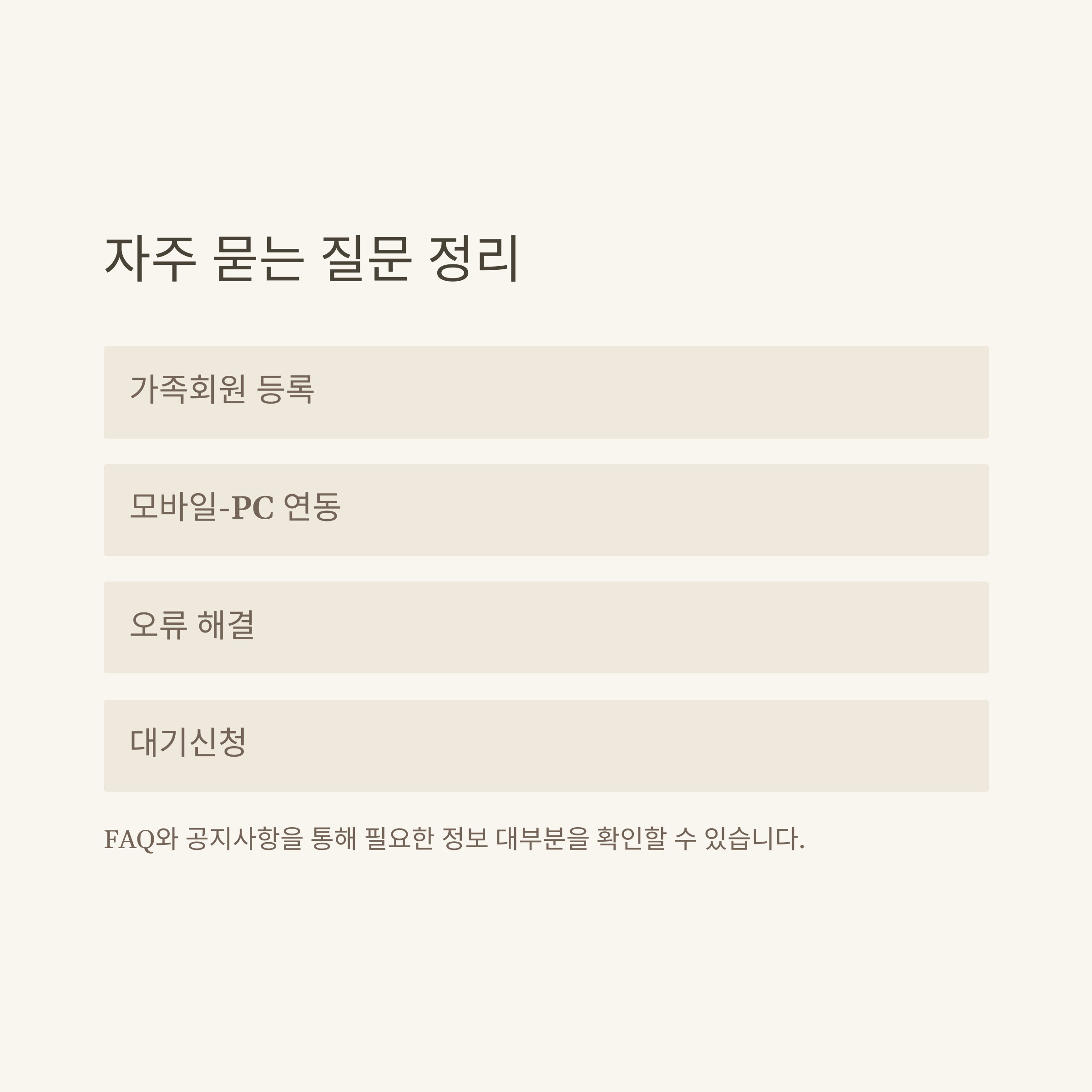 A. 네, 동일 계정으로 로그인하면 예약 내역이 자동 연동되어 언제든 확인할 수 있습니다. - Q4. 예약 오픈일을 놓쳤을 때 대기신청은 어떻게 하나요?