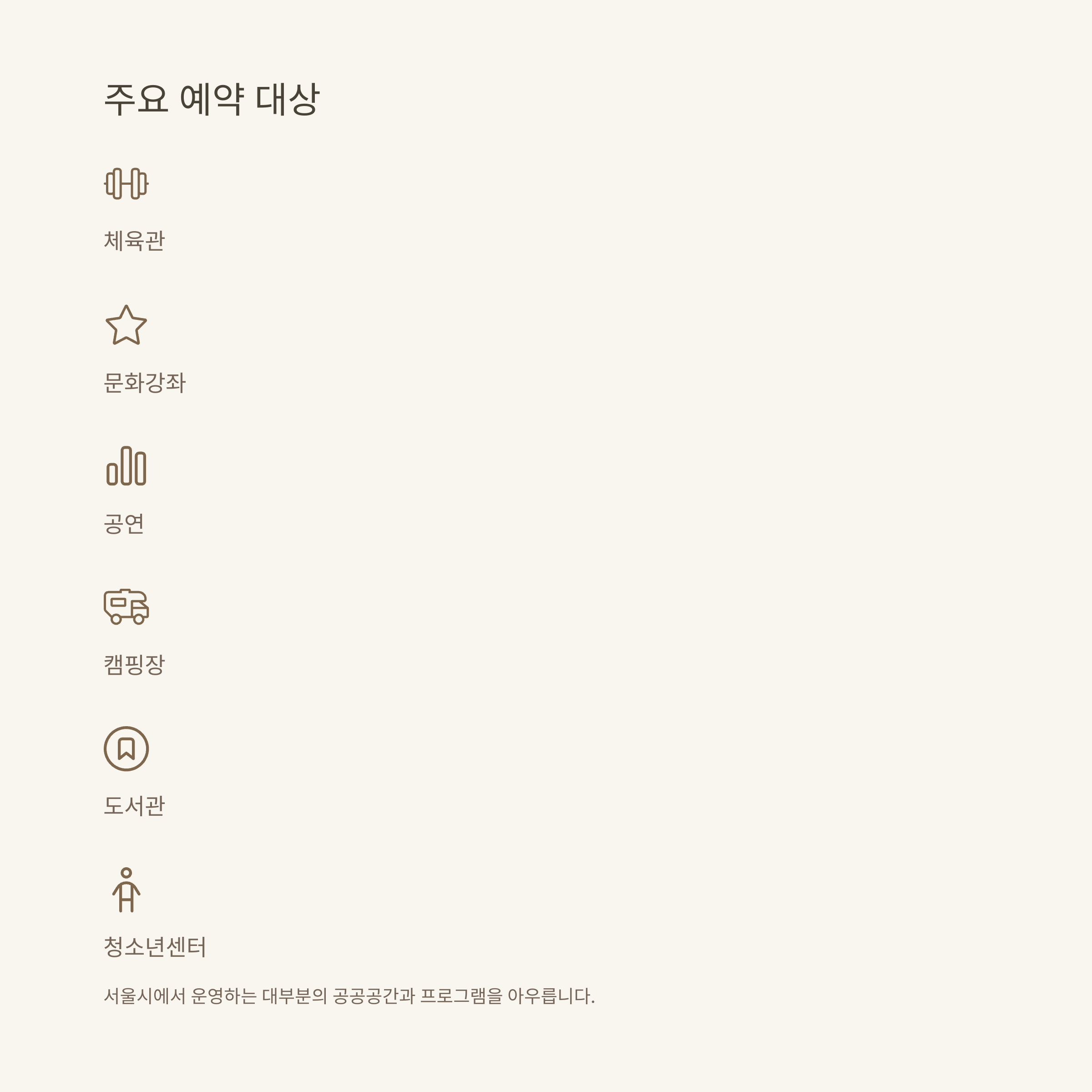- 체육관, 공원, 강좌, 공연, 캠핑장 등 다양한 공공시설 예약