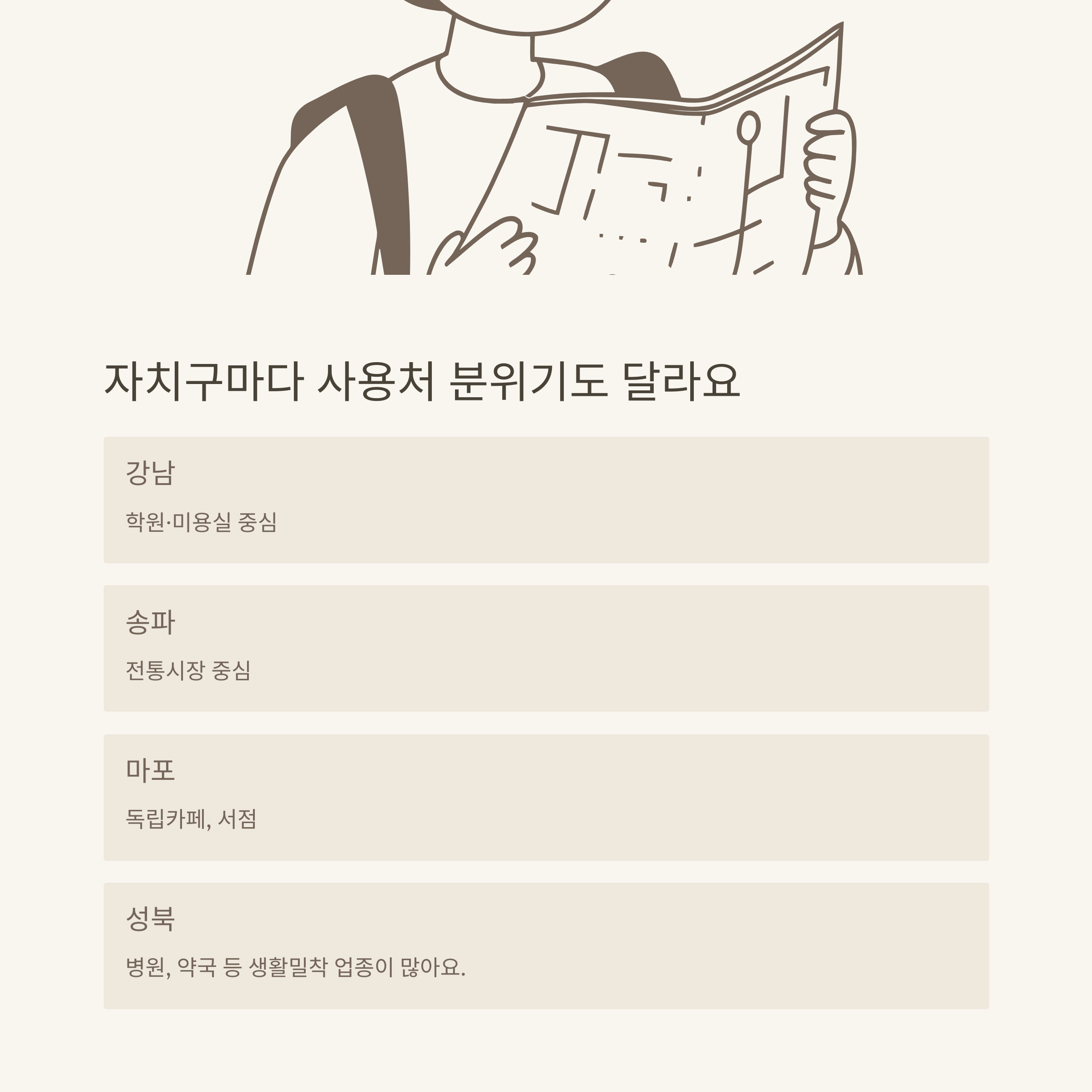 | 강남구 | 동네 식당, 카페, 미용실, 학원 | 프랜차이즈보단 소상공인 위주 |