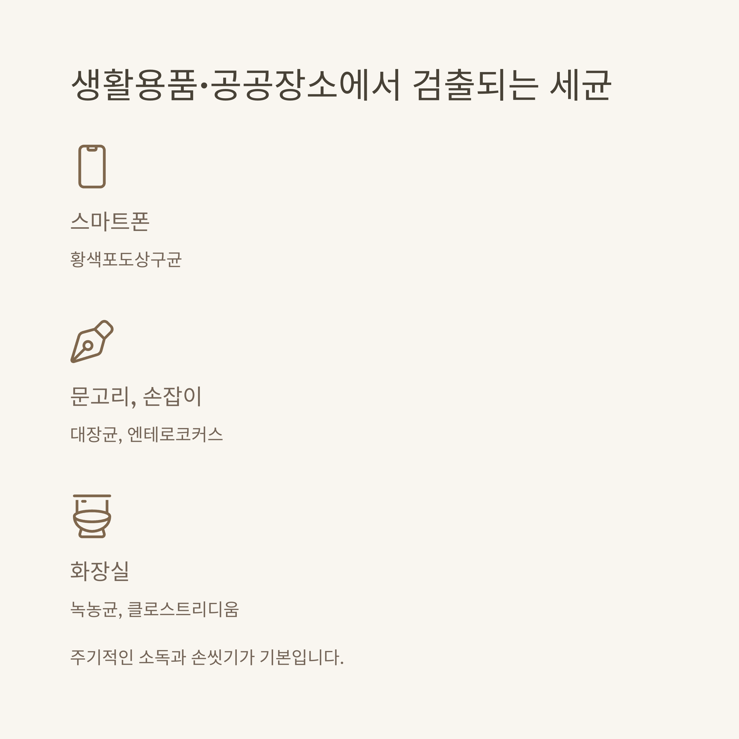 | 생활용품/공간 | 대표 검출 세균 | 위생관리 팁 |