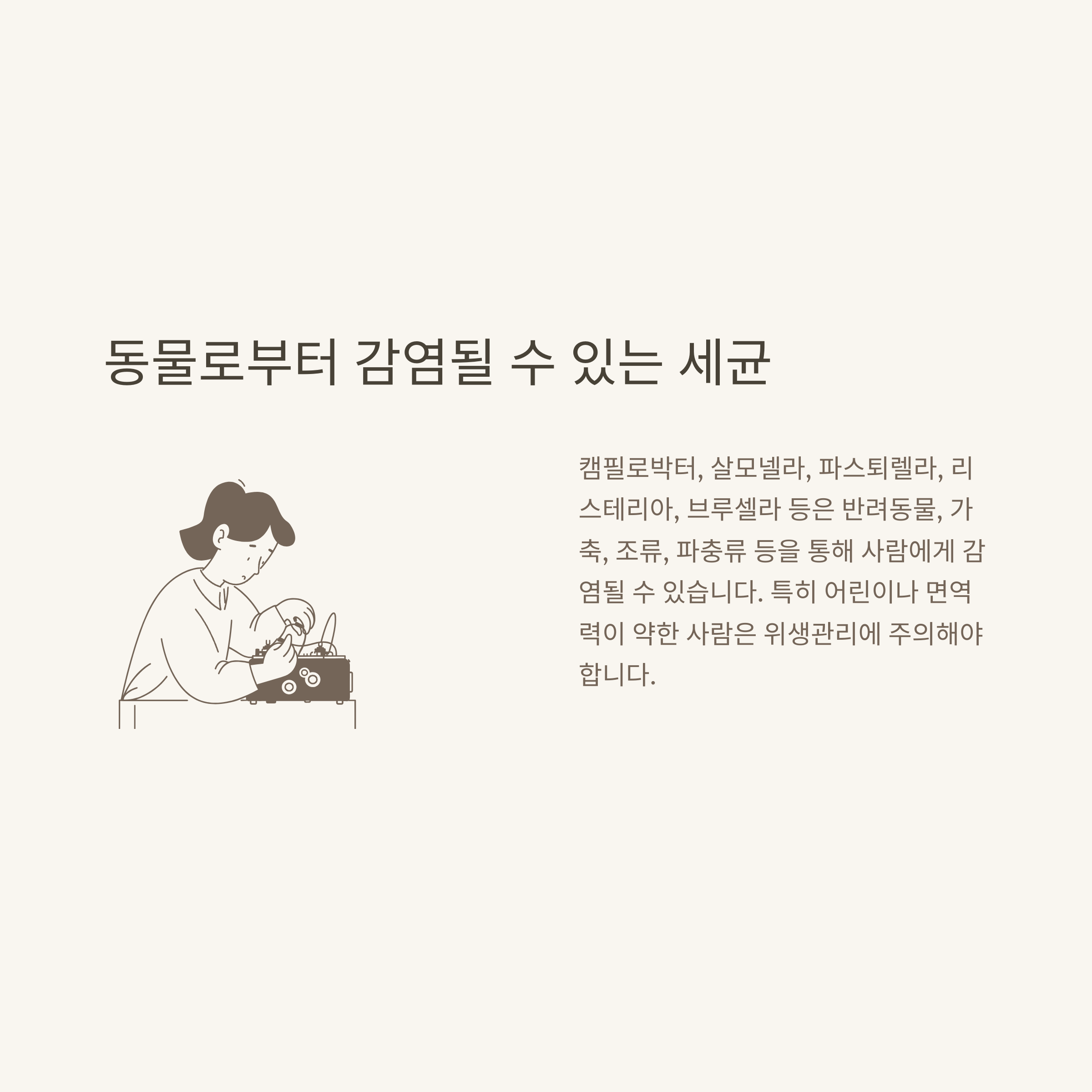 가정에서 반려동물과 생활하다 보면, 동물로부터 옮을 수 있는 세균이 있다는 사실을 뉴스나 수의사 상담을 통해 듣게 됩니다. 저는 애견인 모임에서 ‘캠필로박터 감염 주의’라는 말을 처음 들었을 때, 인터넷으로 세균 종류를 찾아본 적이 있습니다.