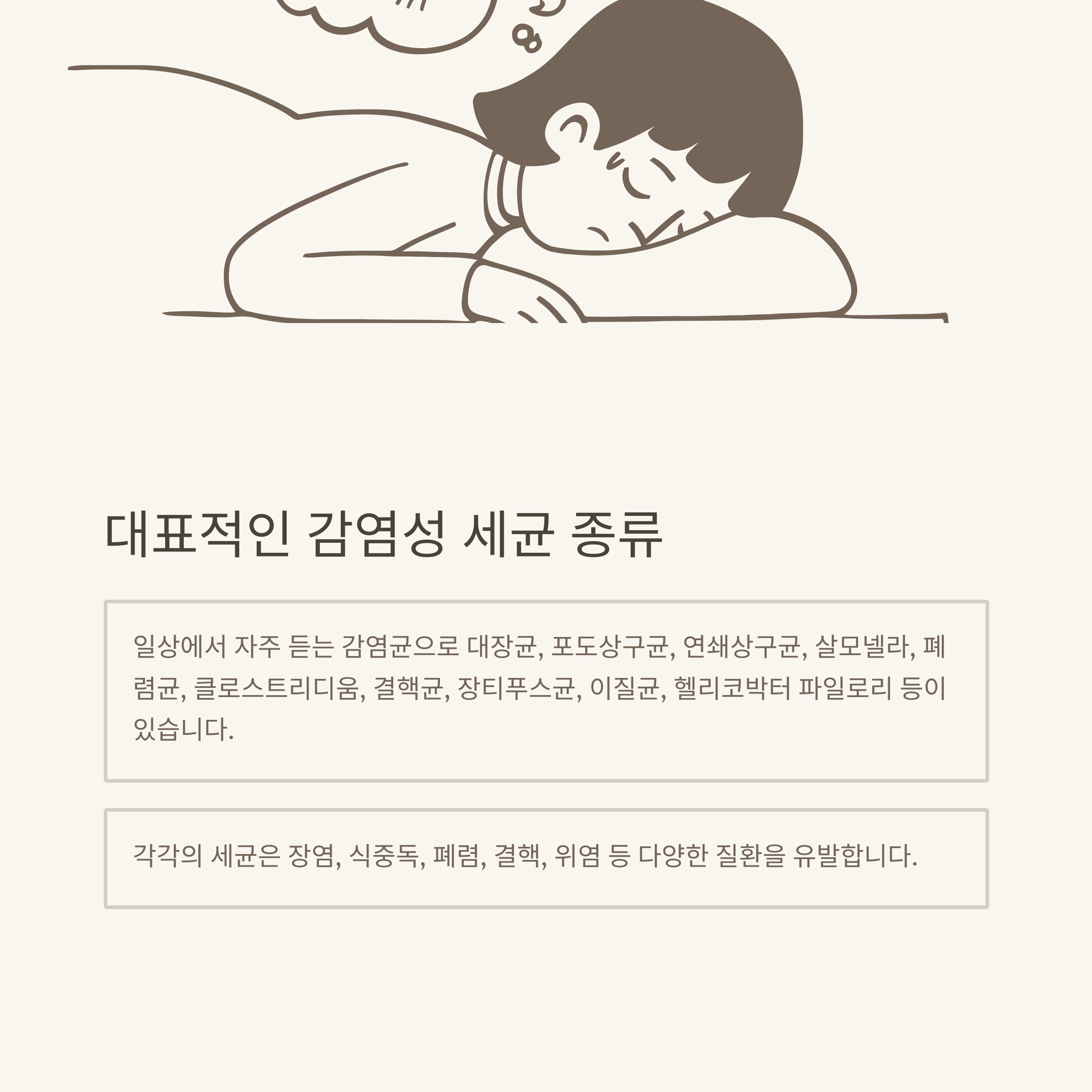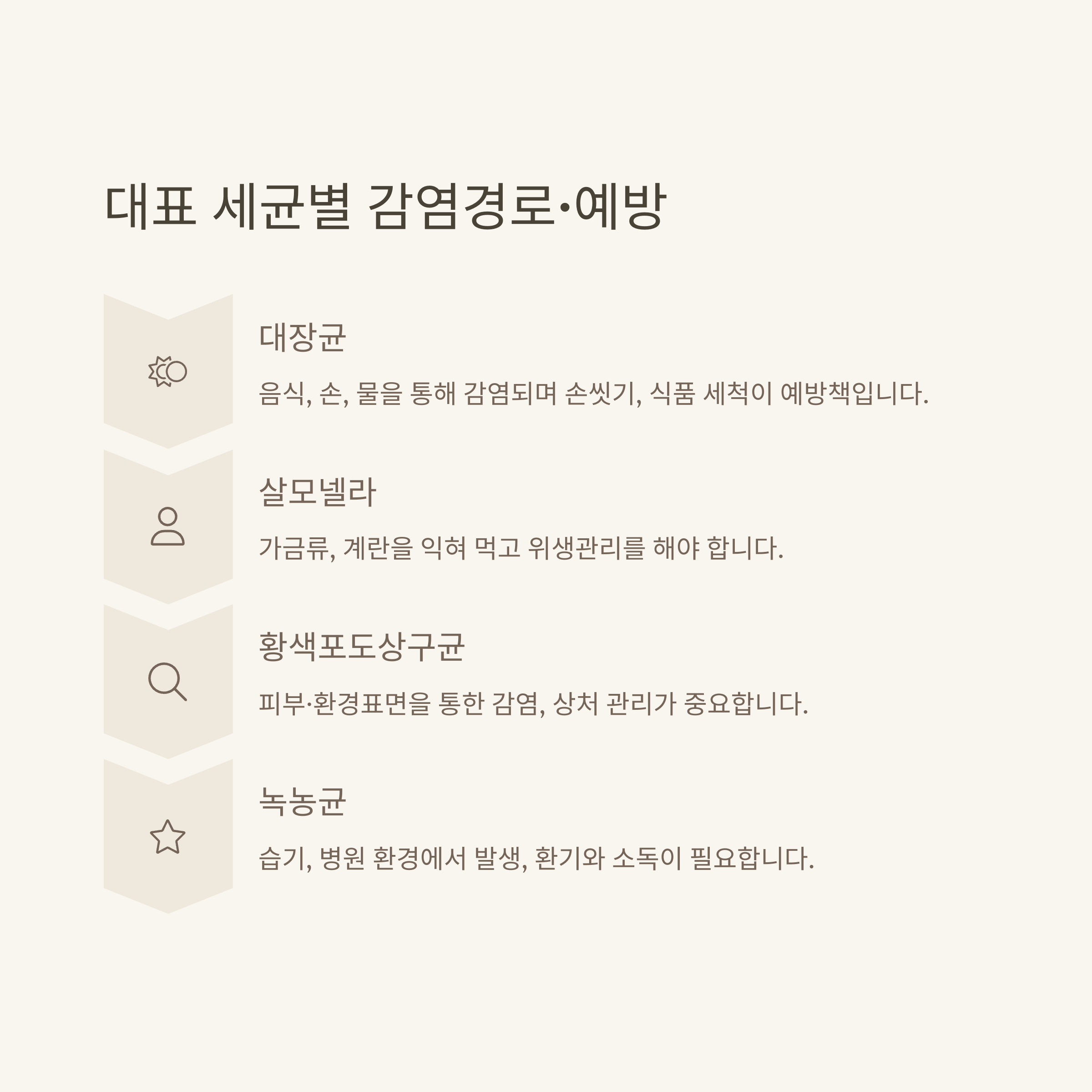 가장 많이 궁금해하는 대표 세균 종류별 감염경로, 주요 증상, 예방 수칙을 한눈에 보기 쉽게 표로 정리했습니다.