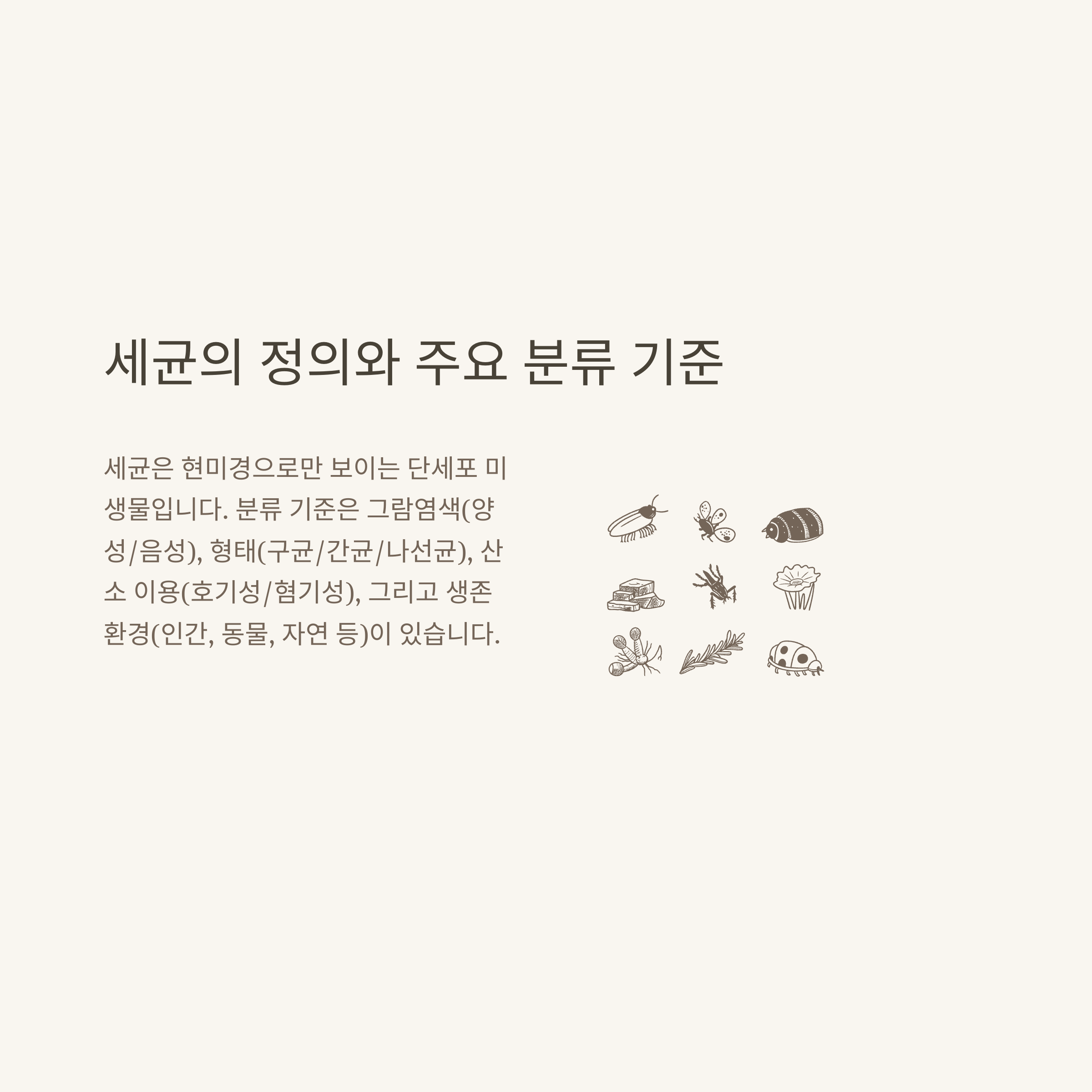 - 구균(동그란 모양), 간균(막대 모양), 나선균 등 형태 분류