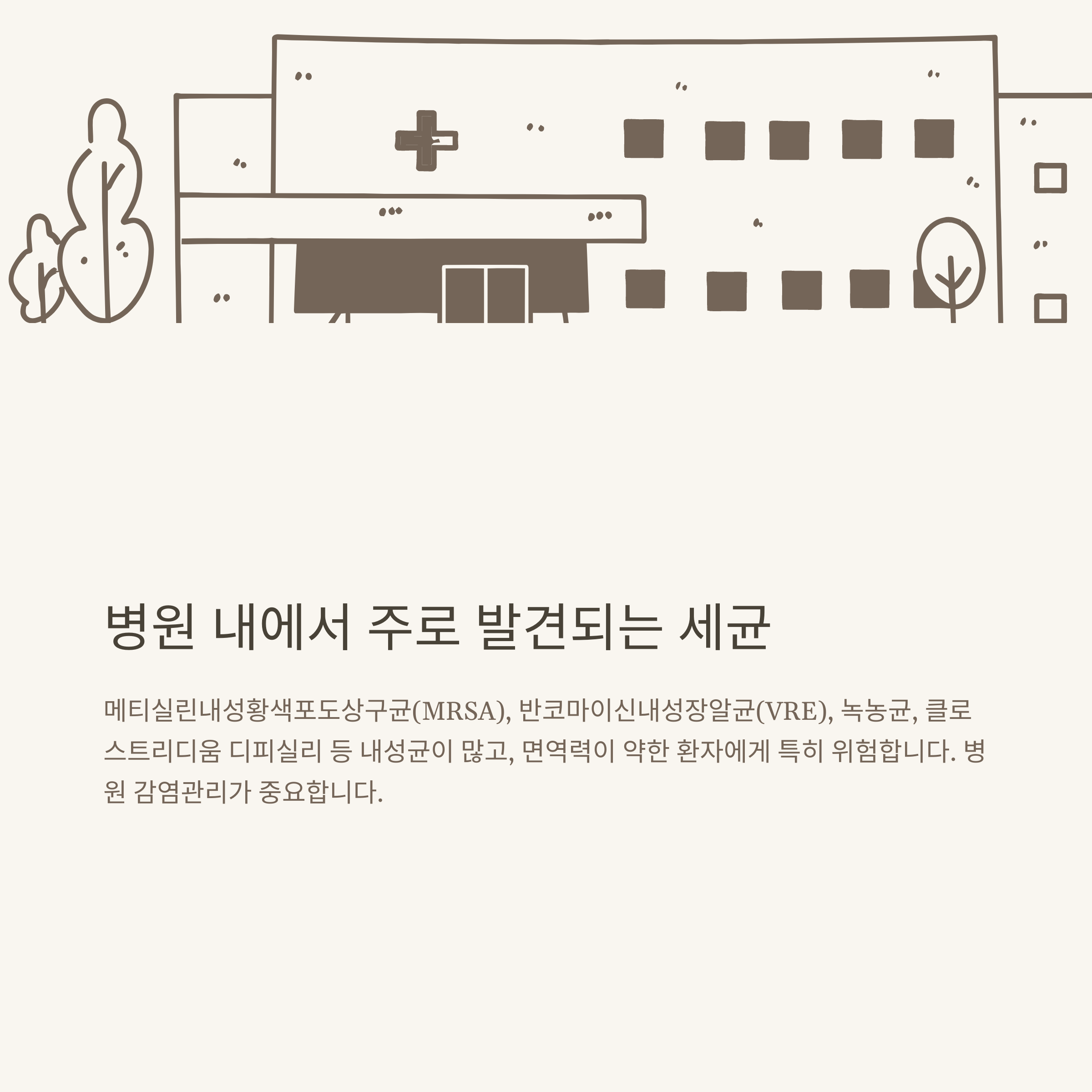 병원에 입원했던 가족을 통해, ‘병원균’이라는 말을 실제로 경험하며 깨달았던 적이 있습니다. 면역력이 약한 환자, 노인, 신생아 등에게 위험한 병원 내 세균은 대부분 내성까지 함께 가지고 있어 감염관리가 매우 중요합니다.