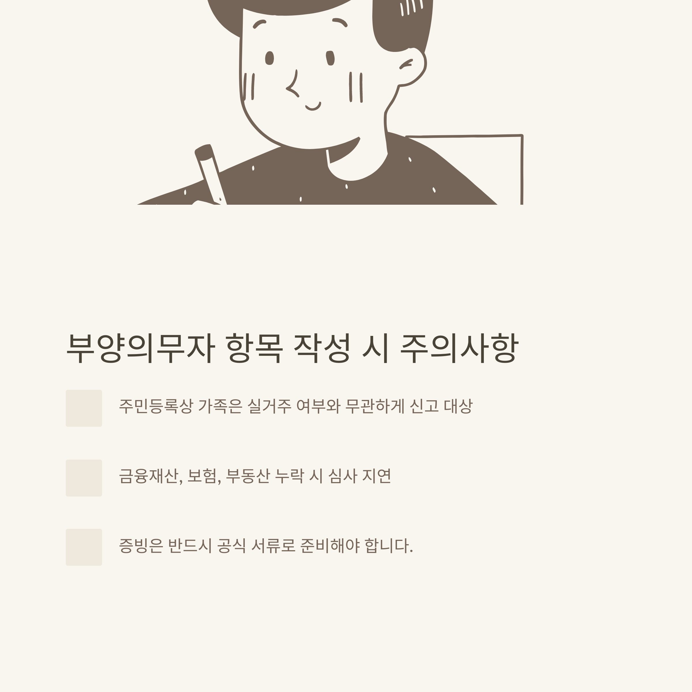 저는 부모님이 따로 거주하시는데도 복지 신청 과정에서 '부양의무자 소득·재산'을 모두 기재하라고 안내받은 적이 있습니다. 특히 복지급여, 장학금 등 공공지원 신청 때는 부양의무자 기준이 매우 엄격하게 적용되기 때문에, 실제 거주 여부와 관계없이 주민등록상 가족(부모, 배우자, 미성년 자녀)은 모두 포함해서 신고해야 합니다. 부양의무자 항목에서 가장 실수하기 쉬운 부분이 바로 '소득·재산 누락'입니다. 금융재산 일부만 작성하거나, 임대차 계약서상 등기되지 않은 부동산을 빼먹는 경우 실제 심사 과정에서 추가 서류 제출을 요구받거나 지원이 거절될 수 있습니다. 저도 부모님 예금잔액, 적금, 보험, 심지어 주식 계좌까지 하나하나 직접 확인해 적었고, 원천징수영수증·재산세 납부확인서 등 공식 증빙서류를 미리 준비해 제출했습니다. 정부24 공식 안내와 동사무소 담당자의 구두 안내를 모두 참고해야 안전하게 작성할 수 있습니다.