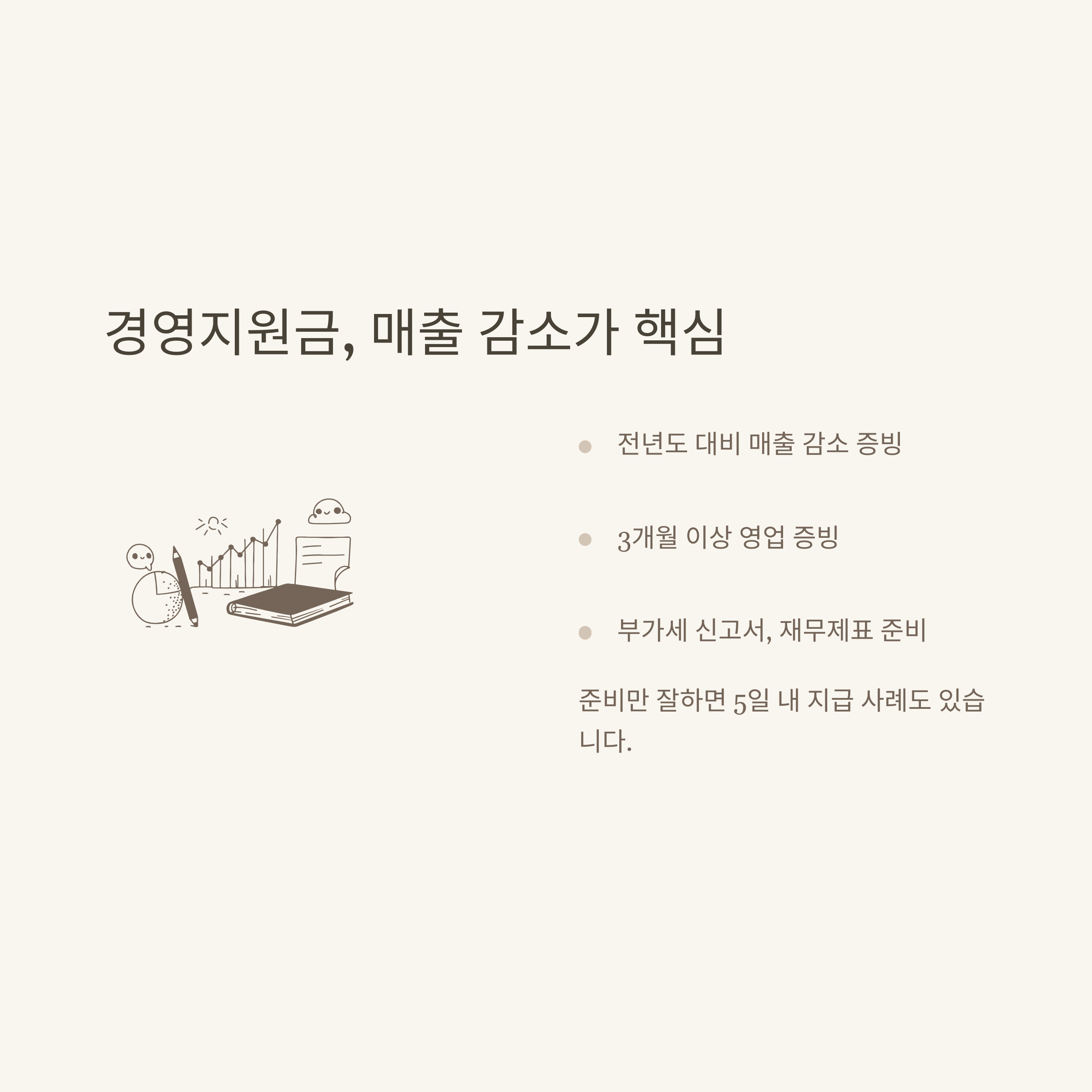 저는 경영난 업종 특별지원금이라는 이름으로 50만원을 받은 경험이 있는데요, 이 지원금은 기본적으로 ‘매출감소’와 ‘사업 지속성’이 키포인트였어요. 신청 시 확인사항: