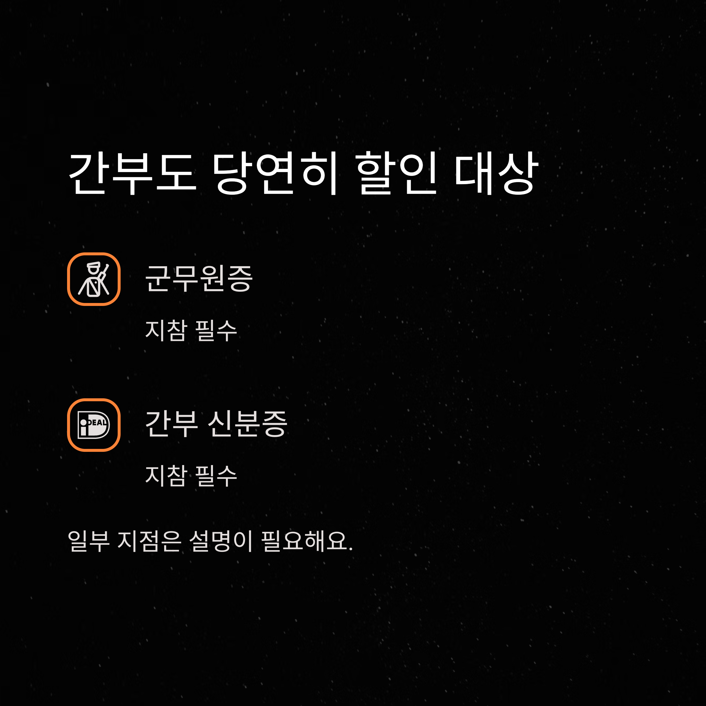 | 현역 병사 | 가능 | 나라사랑카드, 휴가증 |