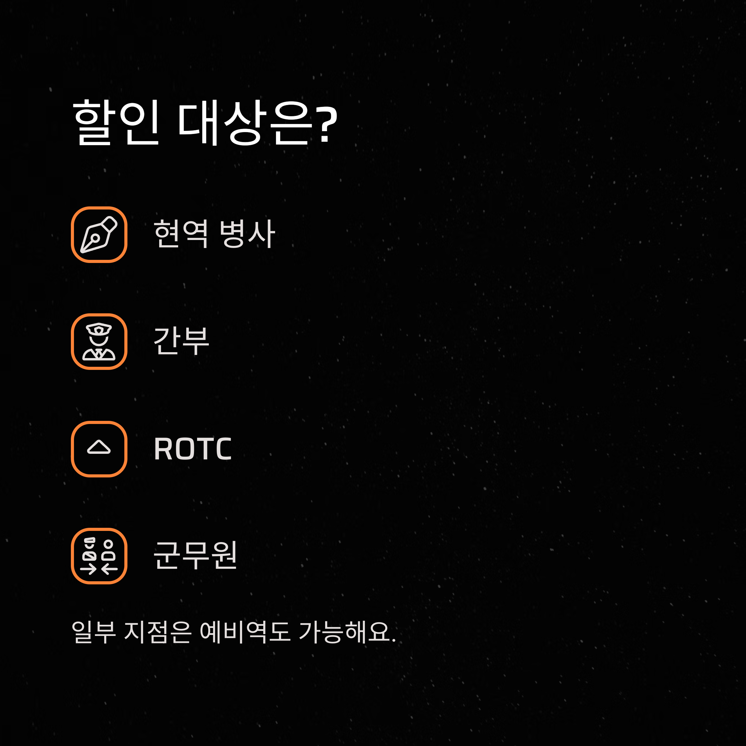 현역 군인은 대부분 할인 대상이지만, 예비역도 일부 지점에서는 할인 적용이 가능한 경우가 있습니다. 저는 예비역 친구와 함께 방문했을 때, 나라사랑카드로 신분을 증빙하고 할인받은 적이 있었습니다. 대상 구분 요약: