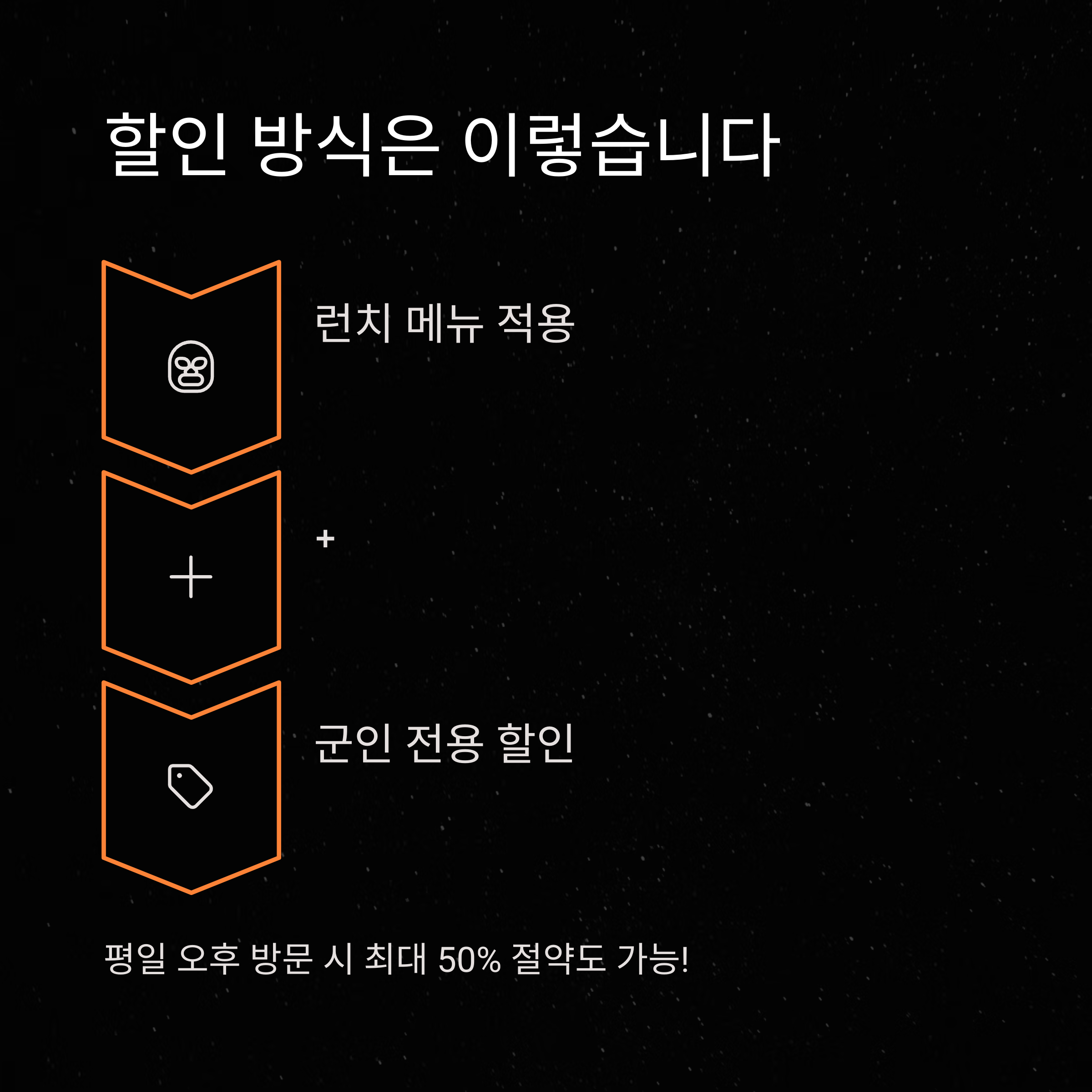 군인 할인도 시간대에 따라 적용 방식이 달라집니다. 저는 평일 오후 2시에 갔을 때는 런치+군인 할인 동시 적용을 받았고, 오후 6시 이후에 방문한 적이 있었을 땐 일부 메뉴에만 군인 할인이 적용되더군요. 시간대별 할인 적용 요약: