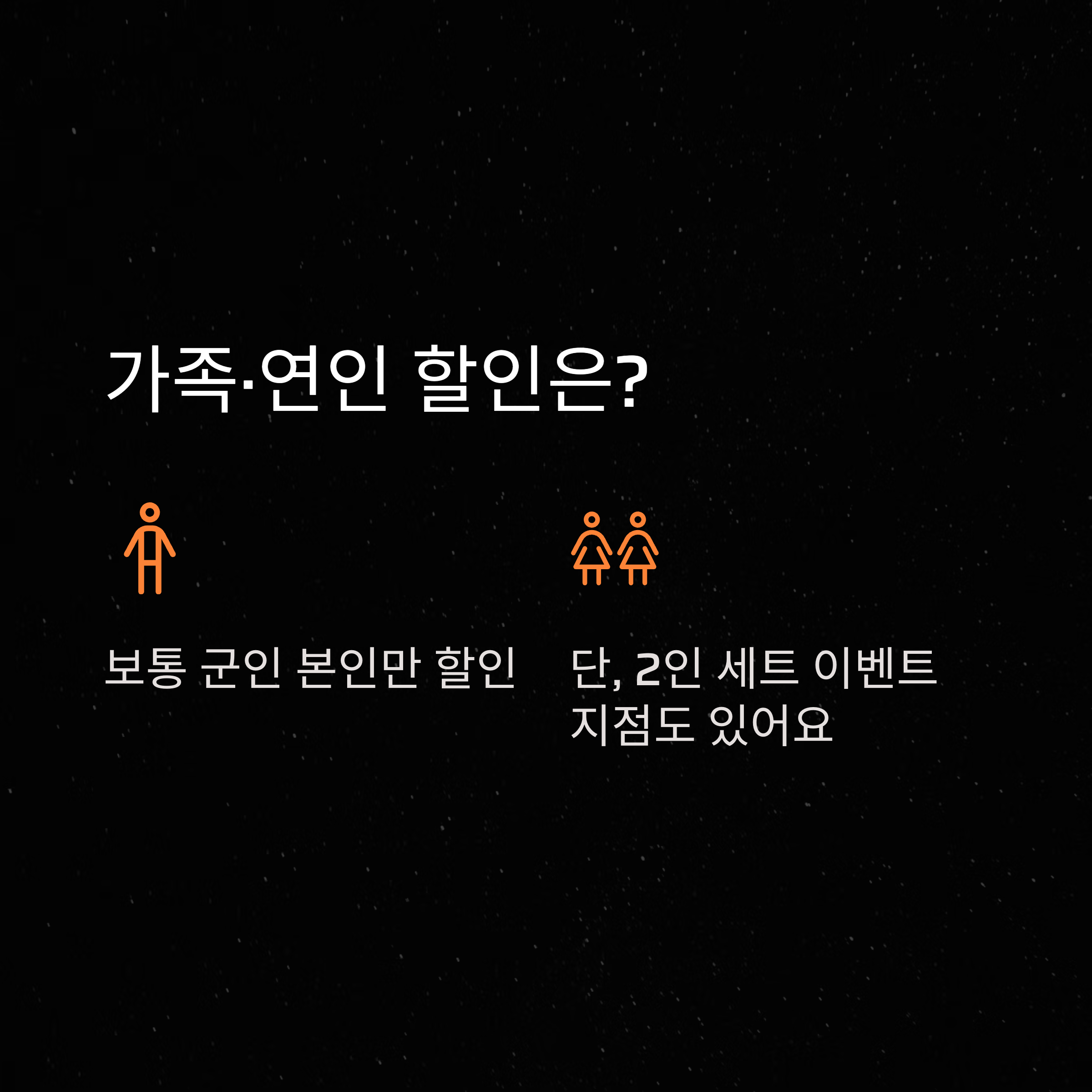 많은 분들이 궁금해하시는 부분 중 하나가 가족이나 연인과 함께 갔을 때도 할인 적용이 가능한가요?입니다. 제가 어머니와 외박 때 함께 갔을 때, 군인 본인 1인에 대해서만 할인된다는 안내를 받았습니다. 실제 적용 기준: