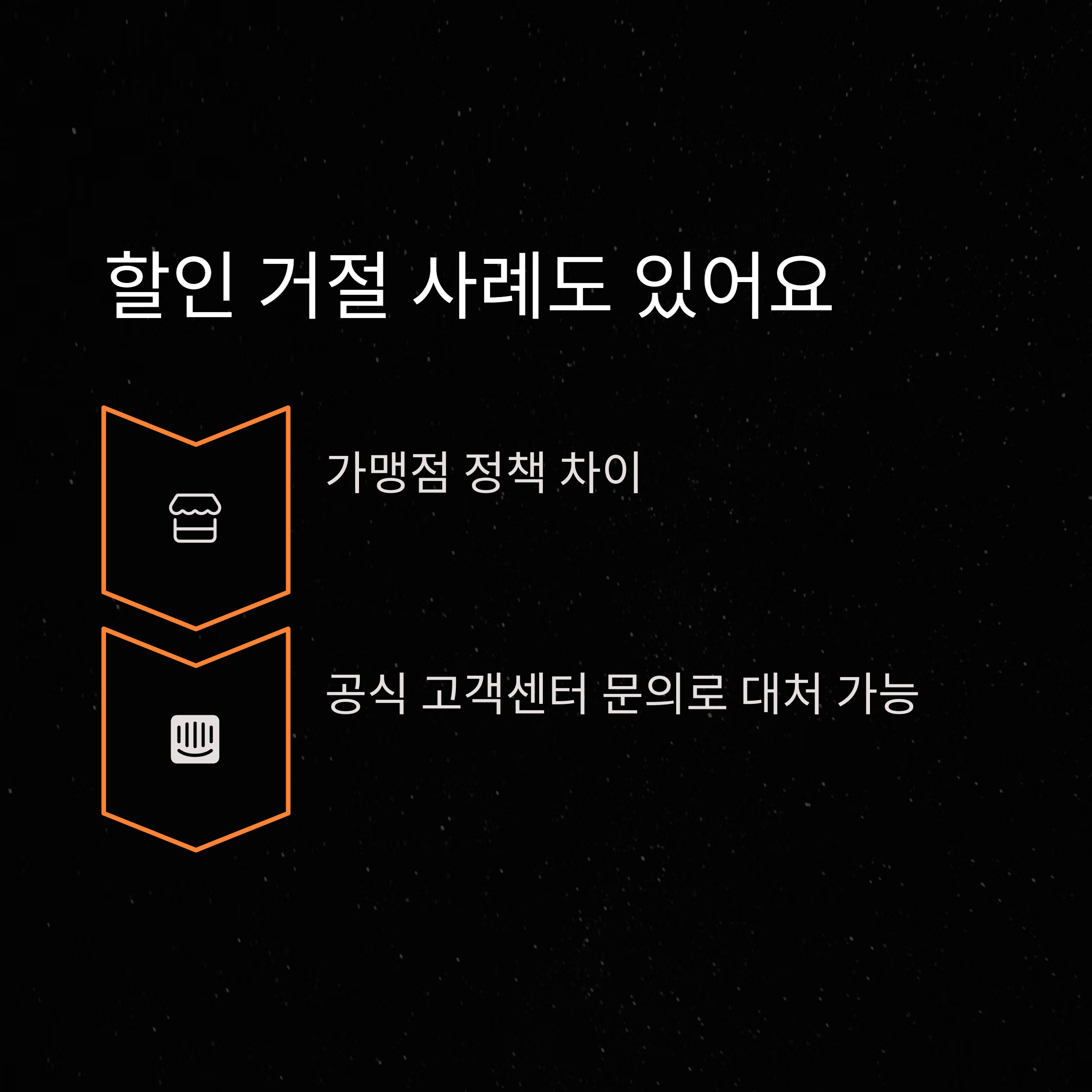 군인 할인 적용이 항상 되는 건 아닙니다. 저도 몇몇 지점에서 “현재는 군인 할인 진행하지 않습니다”라는 말을 들은 적이 있었어요. 특히 프랜차이즈 매장이지만 가맹 형태에 따라 할인 정책이 달라질 수 있다는 점을 그때 알게 됐습니다. 거절 사례: