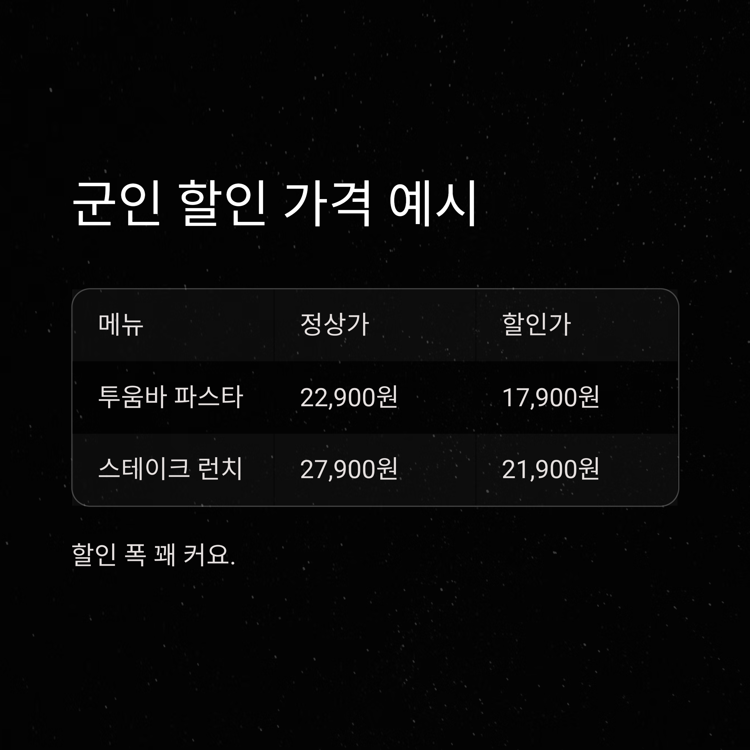 | 메뉴 | 정가 | 군인 할인 적용가 |
