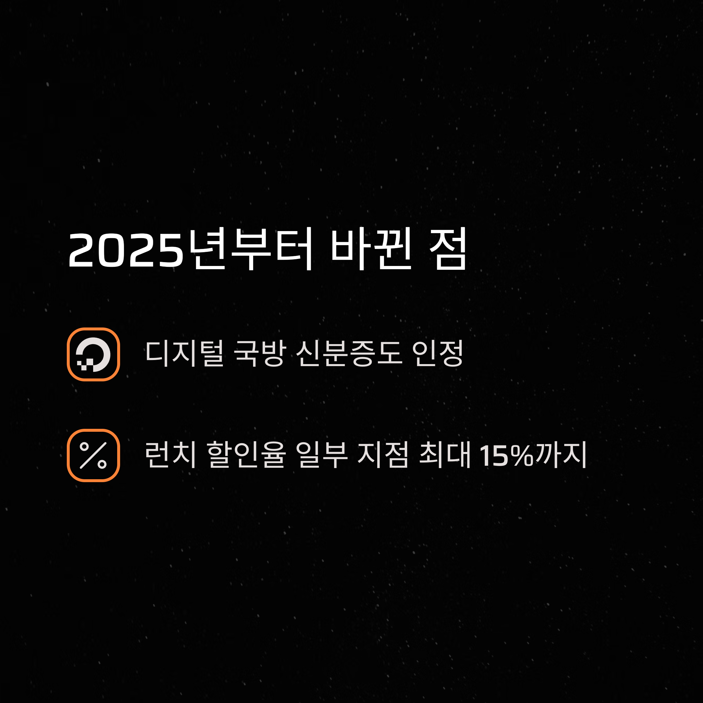 | 필요 증빙 | 나라사랑카드, 휴가증, 군인증, 디지털 신분증 |