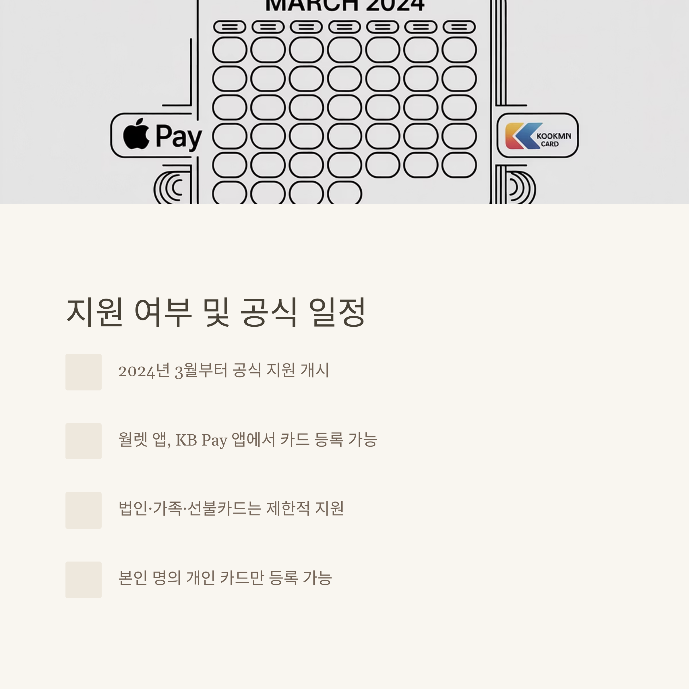 지원 일정은 공식적으로 2024년 3월부터 적용됐고, 국민 신용·체크카드(개인회원)가 월렛(Wallet) 앱, KB Pay 앱을 통해 바로 등록이 가능합니다. 단, 일부 법인·선불·가족카드는 등록이 불가능하니 주의가 필요합니다.