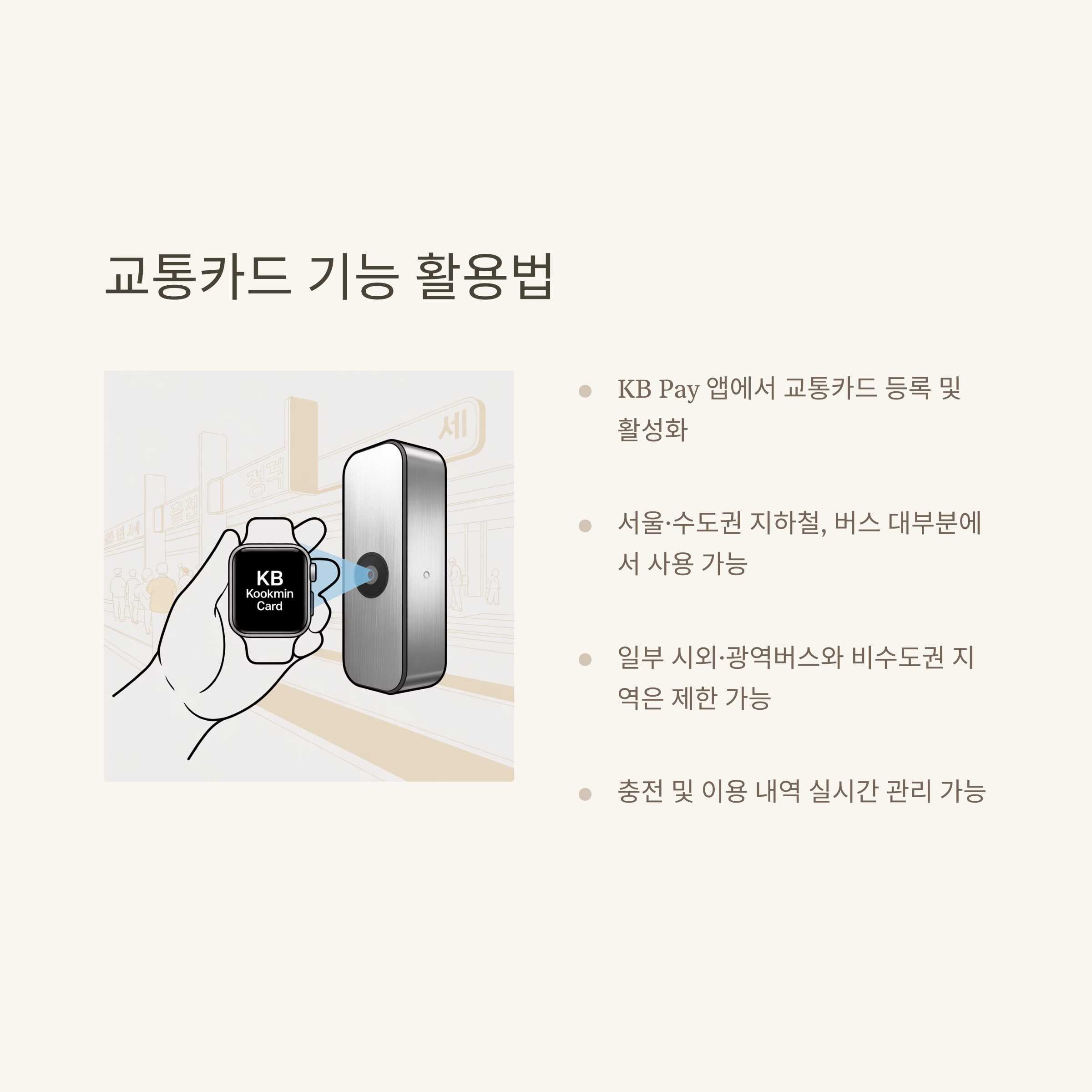 | 교통카드 | KB Pay 앱 교통카드 등록 후 단말기 태그 | 별도 설정 필요 |
