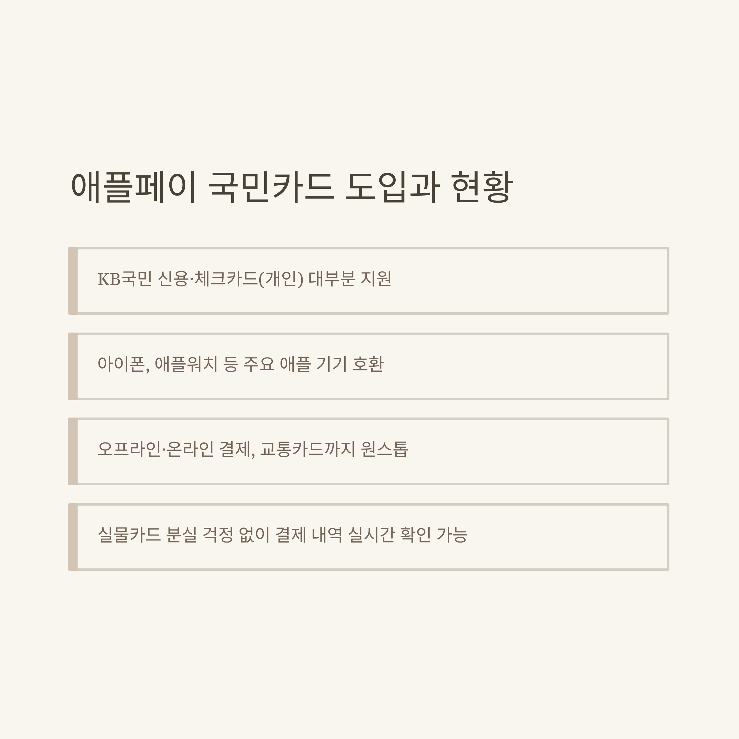 - 온라인: Apple Pay 결제 버튼 → 국민카드 인증 → 결제 완료