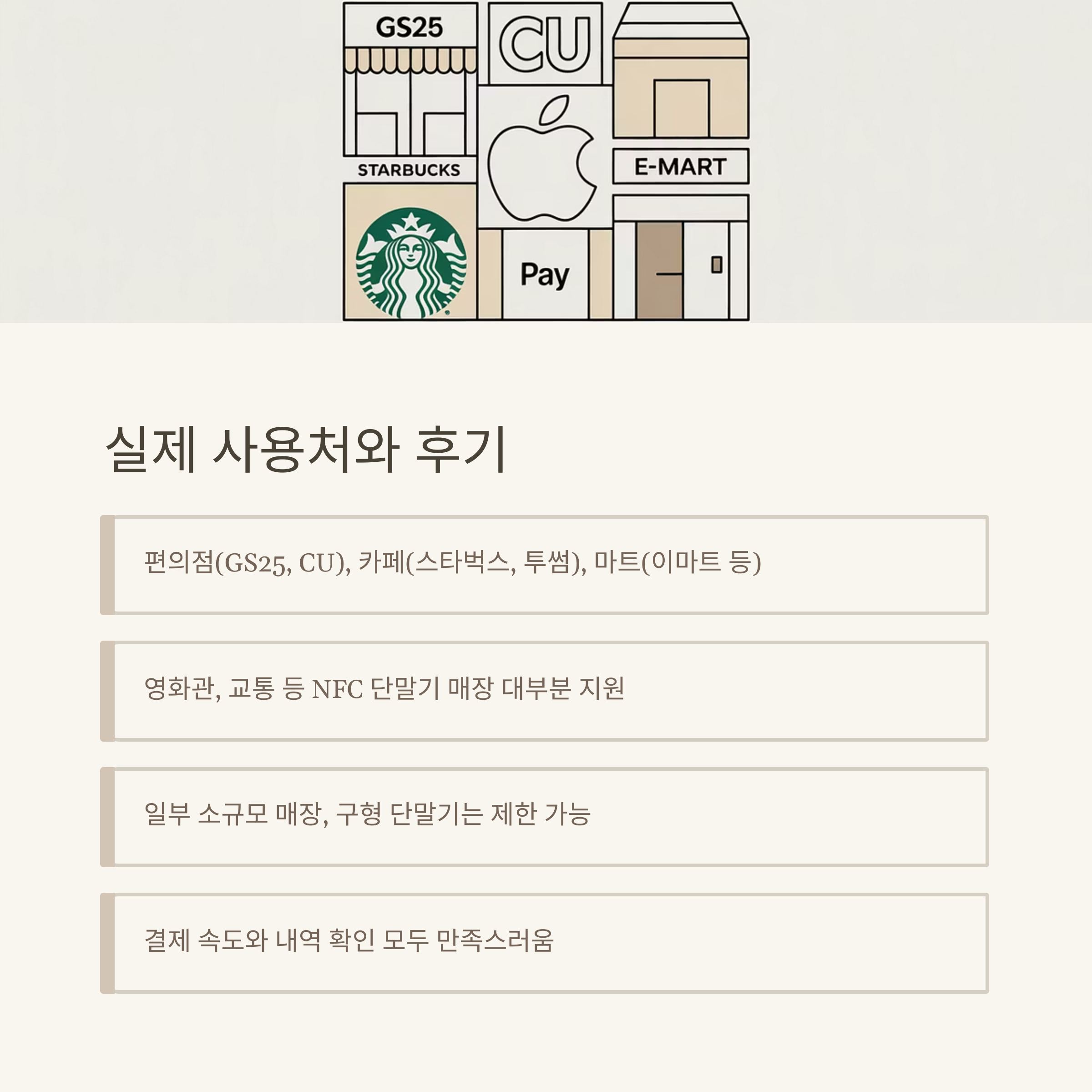 | 편의점/카페 | GS25, CU, 스타벅스, 투썸플레이스 등 | NFC 단말기 필수 |