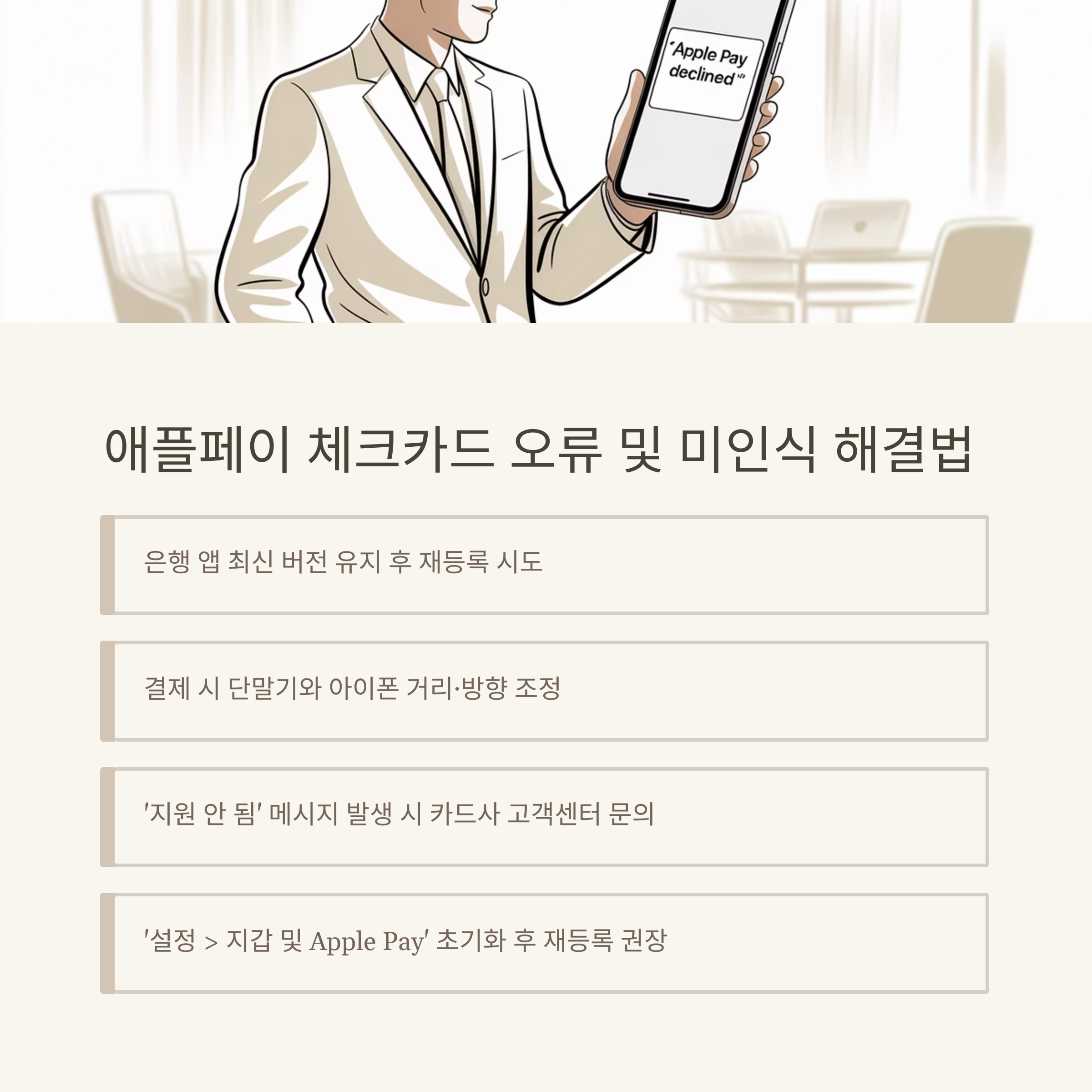이 중에서도 ‘단말기와의 거리’는 가장 간단하지만, 실제로 많은 분들이 놓치는 부분이에요. 아이폰을 너무 빠르게 갖다 대면 인식이 안될 수도 있으니 1~2초 정도 가볍게 올려놓는다는 느낌으로 시도해보세요.