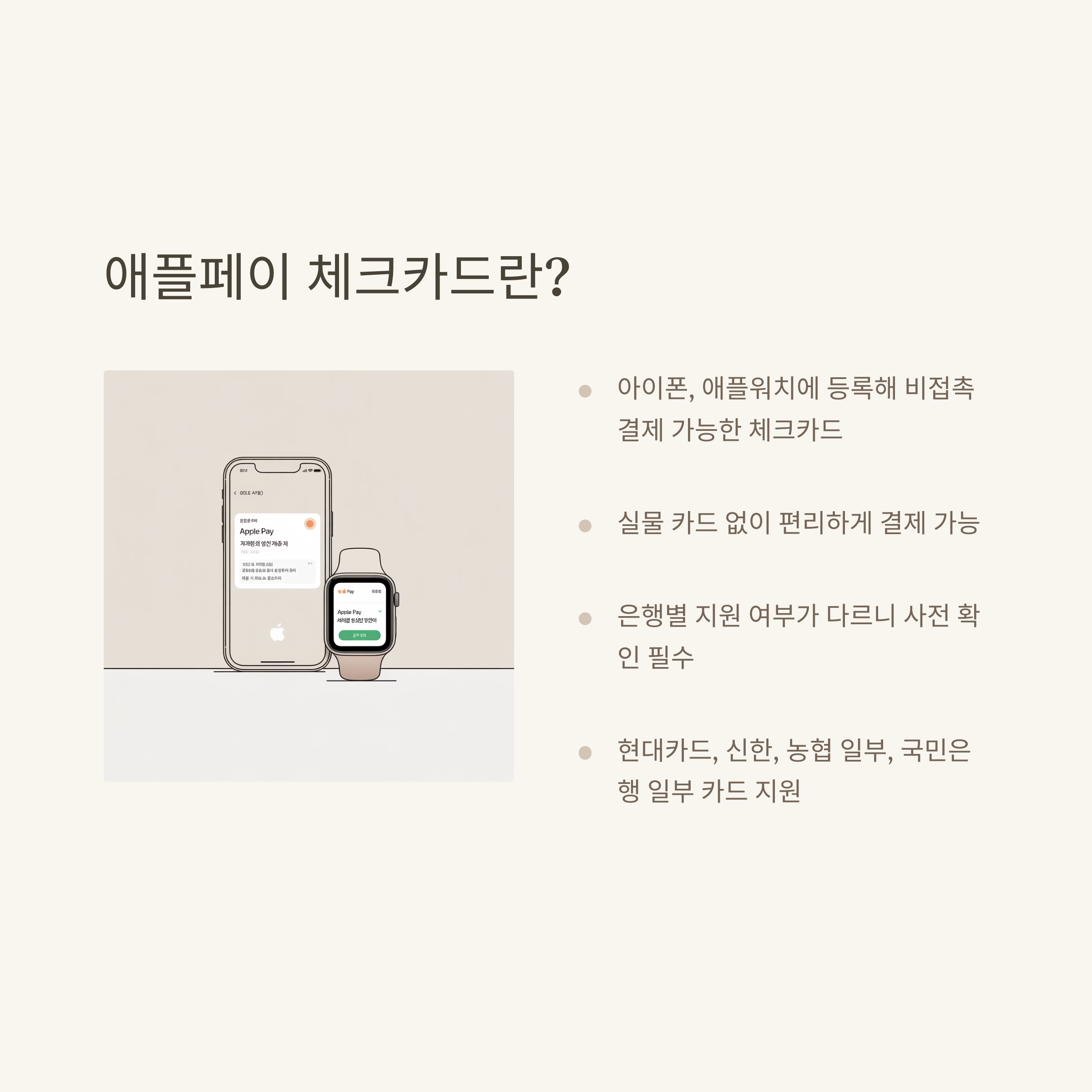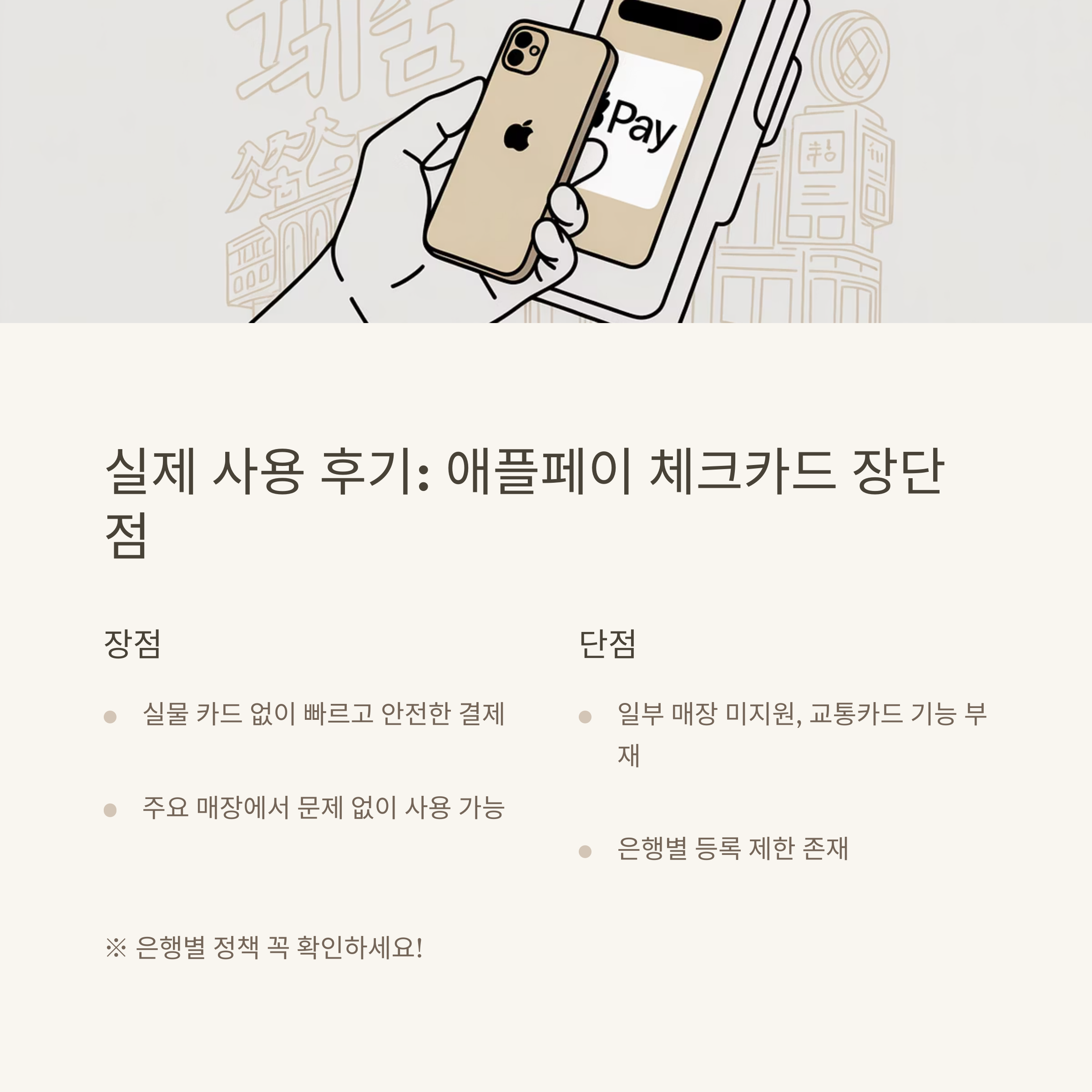 이젠 지갑보다 아이폰이 더 중요하다는 말이 실감날 정도입니다. 다만 아직 국내 인프라가 100% 지원되진 않아서, 체크카드 등록 시 은행별 정책을 꼭 확인하는 것이 좋습니다.
