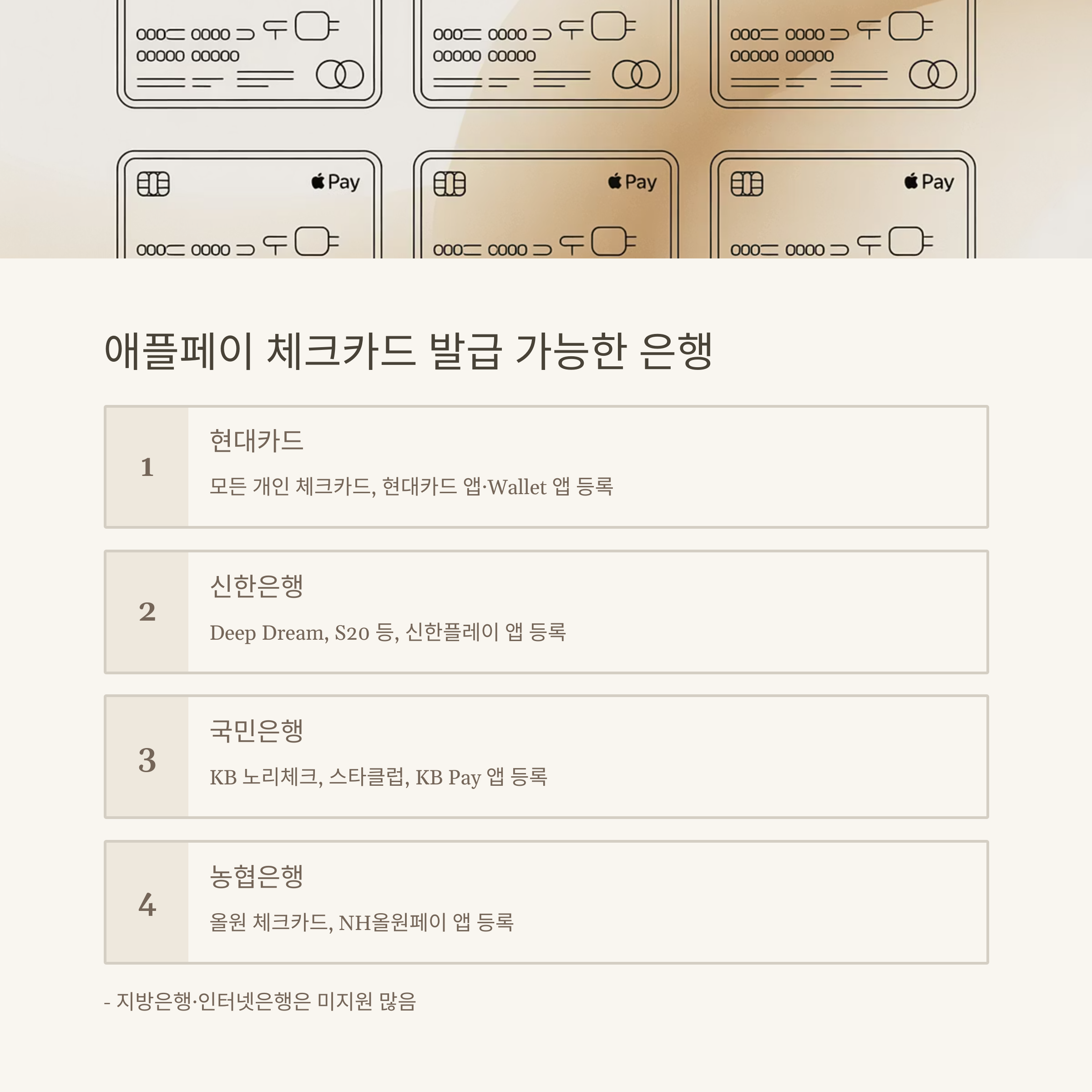 특히 체크카드는 카드사 정책에 따라 애플페이에 등록이 제한될 수 있어요. 예를 들어, 농협 체크카드는 NH올원페이 앱을 통해서만 등록이 가능했고, 국민은행은 KB페이 앱에서만 애플페이 등록이 지원됐습니다. 이 점 꼭 참고하셔야 합니다.