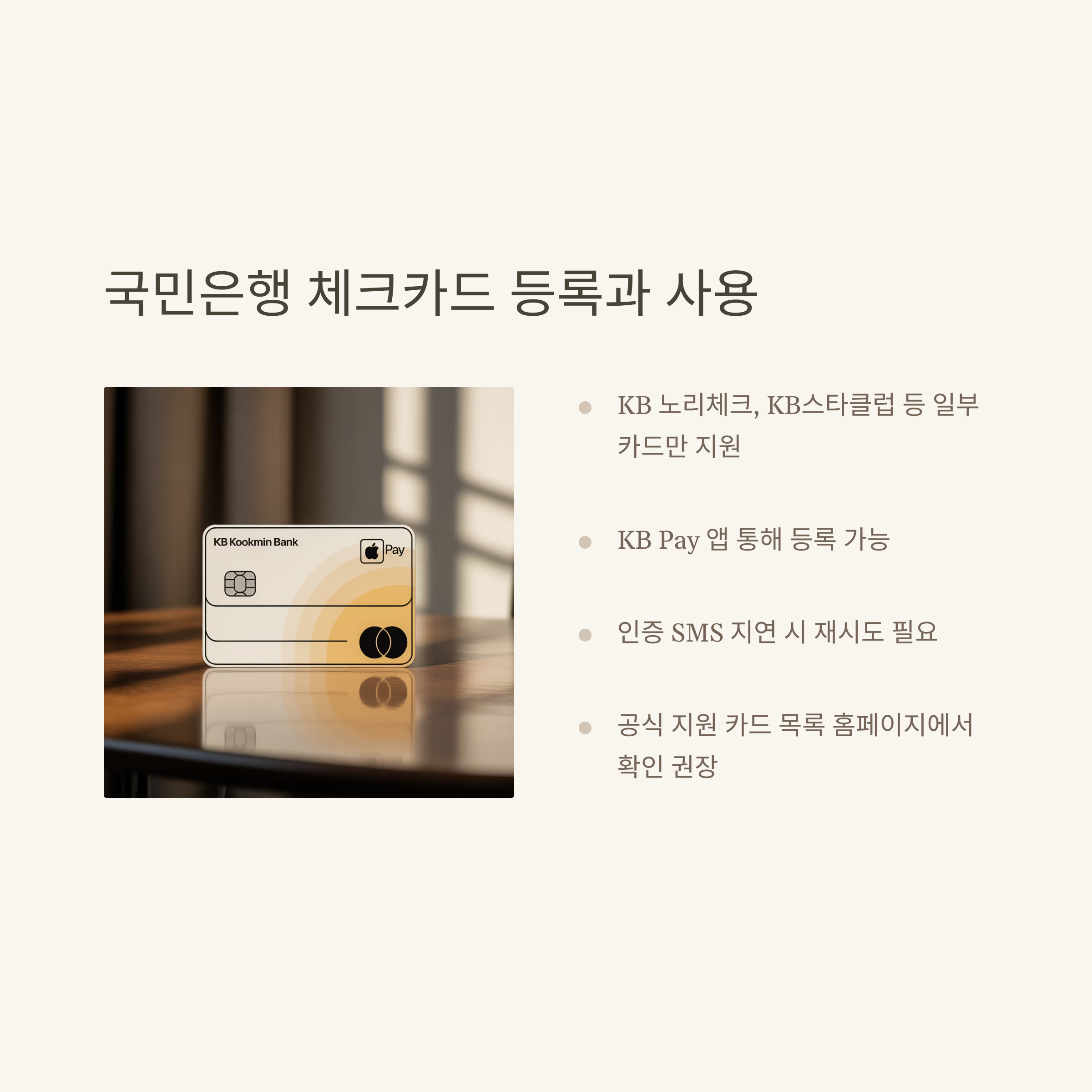 제가 등록 시도할 때는 인증 SMS가 늦게 와서 살짝 당황했는데, 재시도하니 문제 없이 연동됐어요. KB국민카드 홈페이지에서도 애플페이 사용 가능 카드 목록을 확인할 수 있으니 참고하시면 좋습니다.