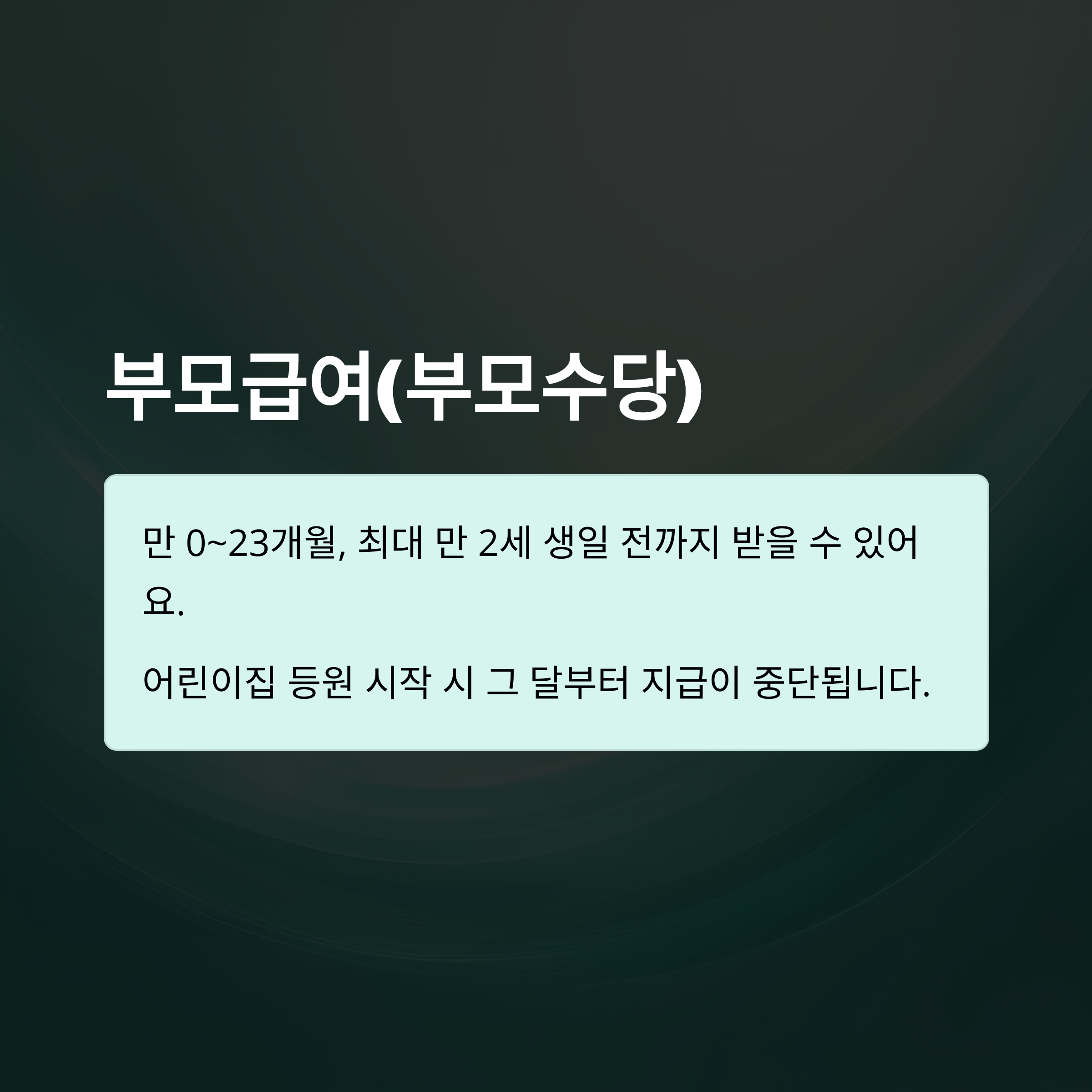 - 부모급여: 만 0~23개월까지, 최대 만 2세 생일 전까지 지급