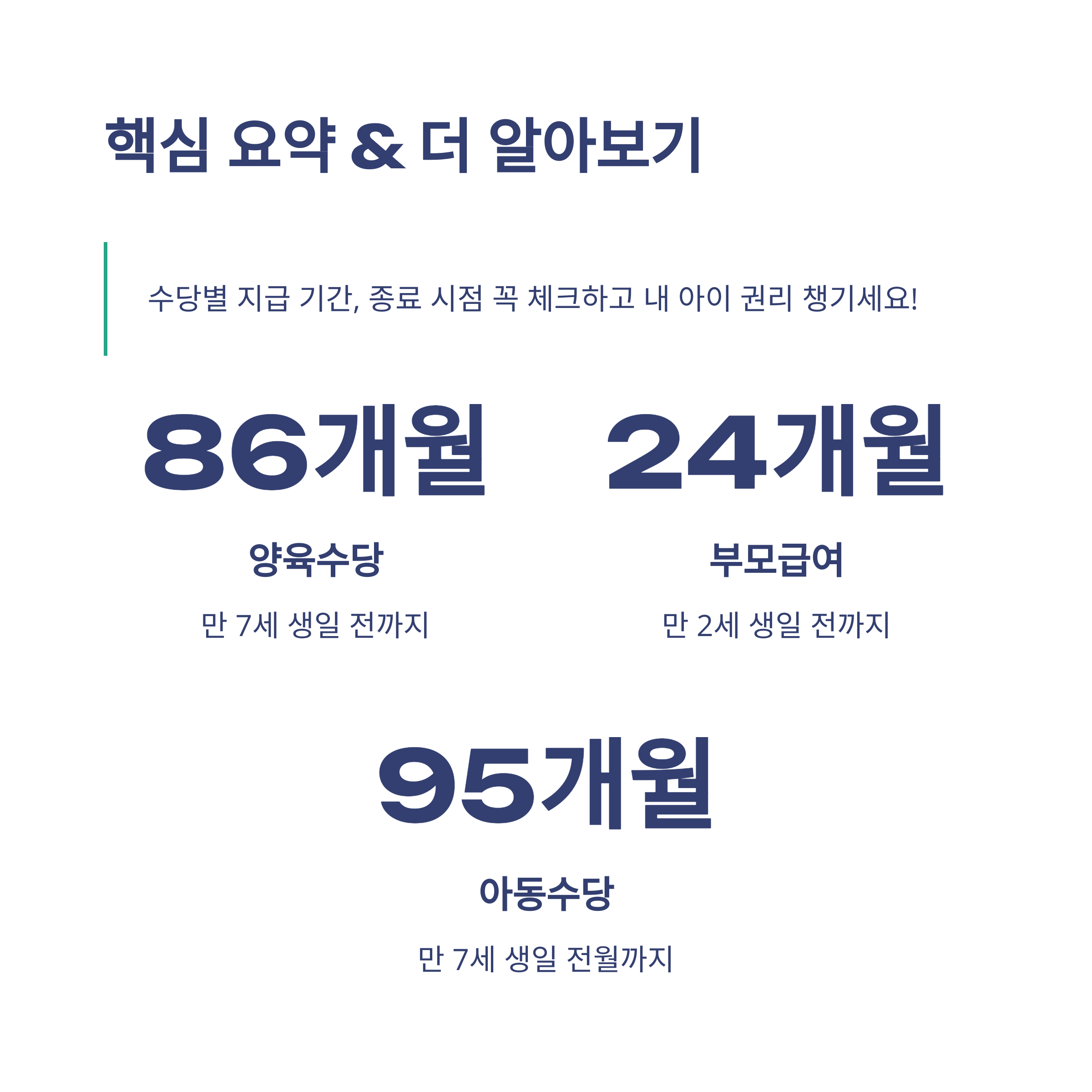 이 표만 참고해도 내 아이가 언제까지 어떤 수당을 받을 수 있는지 한눈에 정리할 수 있습니다.