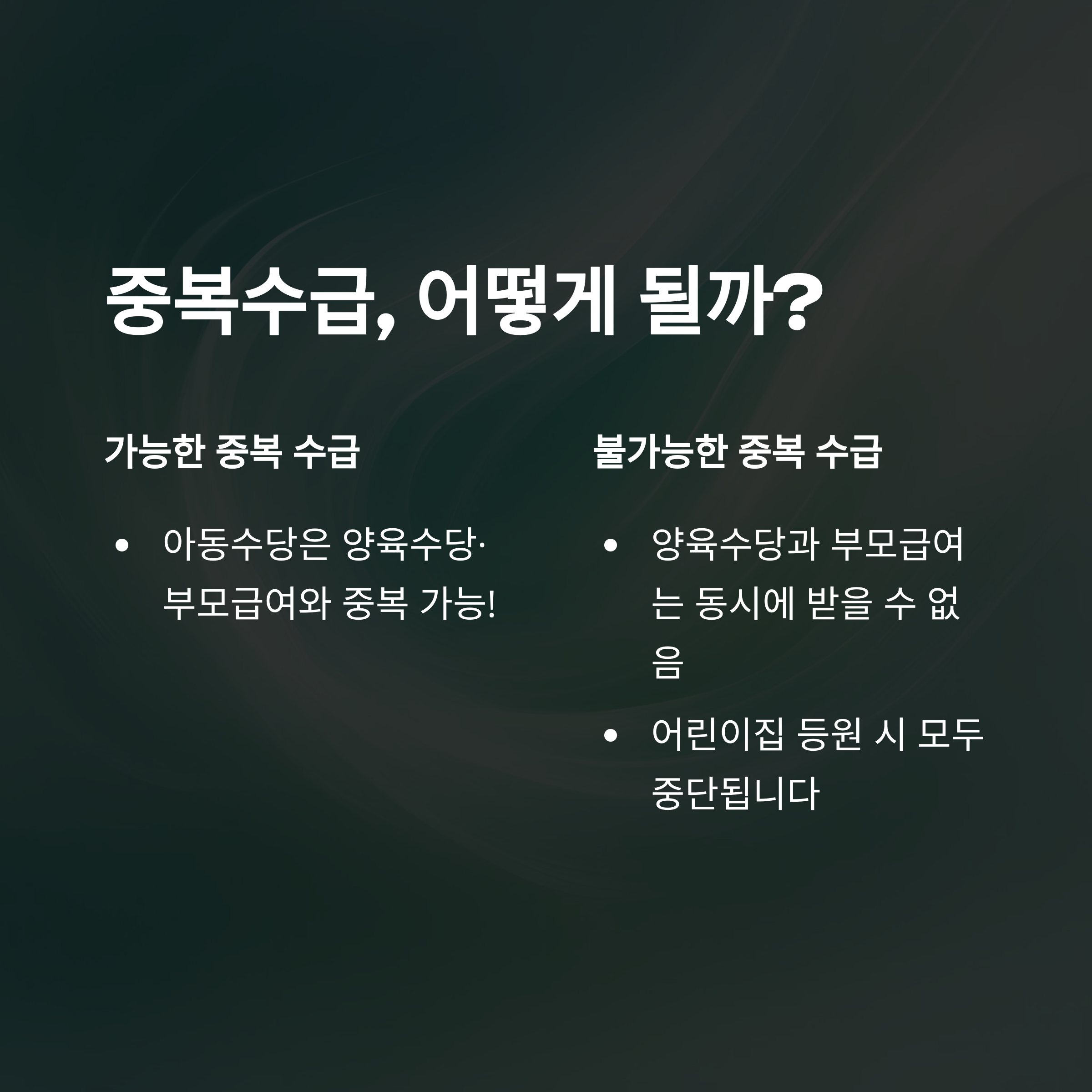 | 양육수당+아동수당 | 가능 | 아동수당은 중복 허용 |