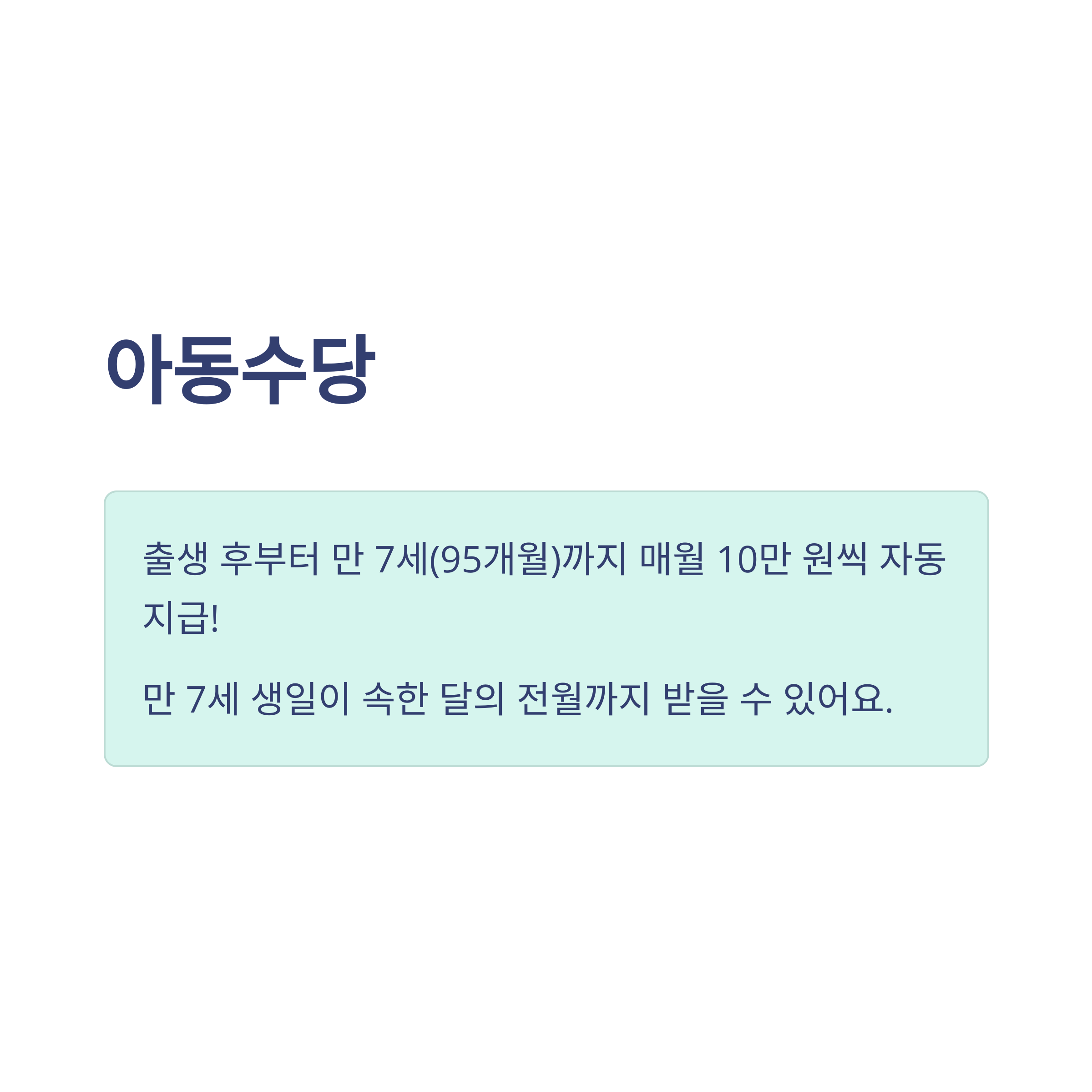 - 아동수당: 만 7세(95개월)까지 매월 10만 원