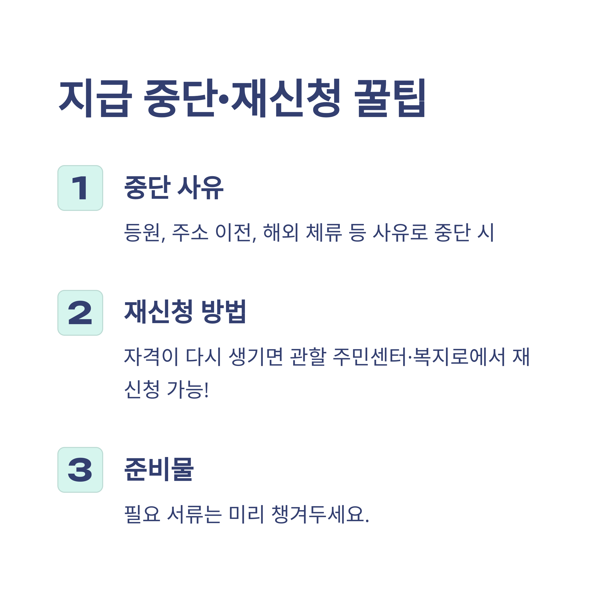 중단·재신청은 생각보다 간단하지만, 자격 유지 여부와 필요 서류를 꼭 챙겨야 신속히 지급을 이어받을 수 있습니다.